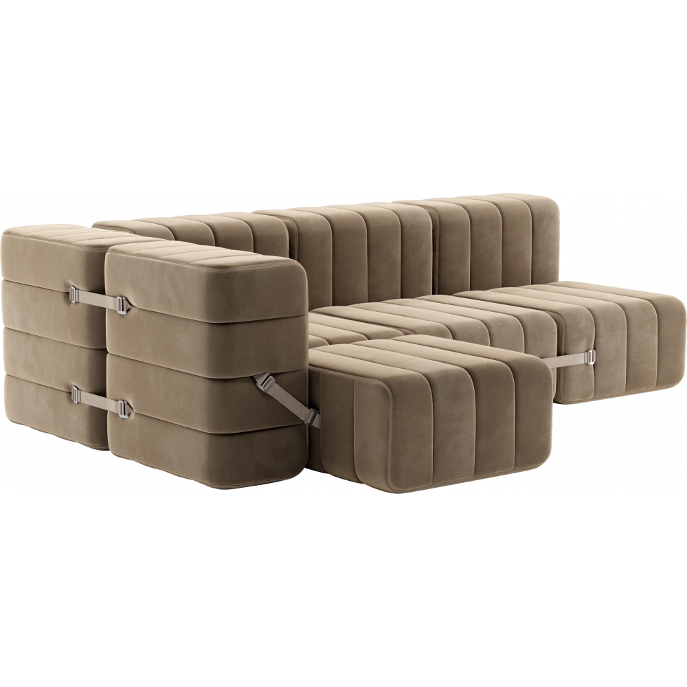In allen neun Ecken. Neun Module sind das Familien-Set im Modulsofasystem. Ein Eck-Sofa für vier, oder, wenn etwas Abstand gefragt ist, auch vier einzelne Sessel. Auch eine Ausweichschlafoption steckt in diesem Set. Zur not sogar für drei Personen. Aber bei einem echt modularen Sofasystem hört es damit natürlich noch lange nicht aus.Im Inneren eines jeden Curt Moduls findet sich nicht nur ein stabiler mit Polstergurten bespannter Sperrholzrahmen, sondern auch eine aus drei unterschiedlichen Schichten bestehende Kaltschaumpolsterung. Contract: Alle Materialien können auf Wunsch für den Einsatz in Hotels oder öffentlichen Gebäuden ausgerüstet werden.