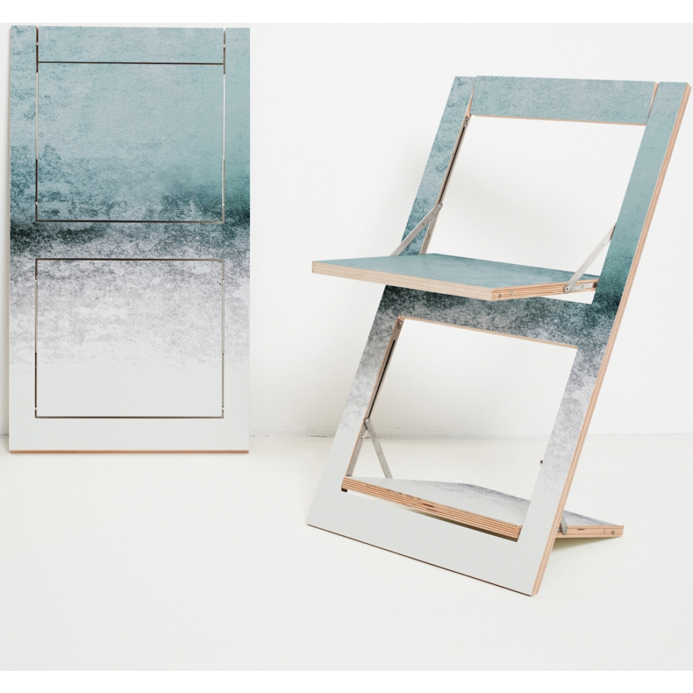 Zugegeben, die Idee ist etwas flach. Der Fläpps Klappstuhl. Endlich darf ein Klappstuhl bleiben. Fläpps muss nicht hinter den Schrank, in die Kammer, die Nische, wie die meisten seiner Artgenossen. Seine Motive machen ihn salonfähig. Steht er doch mal im Weg, passt er auch in die kleinste Lücke. Fläpps ist 20mm flach. Klappt man oben, klappt es unten. Ein Handgriff reicht aus. Denn eigens für Fläpps wurde ein Klappmechanismus entwickelt. Dabei ist Fläpps so stabil wie die meisten anderen Klappstühle und, dank flexibler Rückenlehne und des leichten Federns, bequemer als man denkt. Ein freischwingender Klappstuhl. Ein stabiler und bequemer Klappstuhl aus einer 2 cm Platte, der mit Bildern bedruckt als Wandschmuck an der Wand hängen kann. Zurückhaltung war die oberste Maxime bei der Gestaltung von Fläpps: klare Symmetrien und Linien, eindeutige Materialität bis ins Detail und eine bedingungslose Widmung der Funktion – der Funktion verschwinden zu können und immer parat zu stehen. Dabei verbirgt der nur 20mm starke Klappstuhl eine komplexe Technik. Eine innere Mechanik lässt Fuß- und Sitzteil synchron mit einem Handgriff ein- und ausgleiten und die flexible Rückenlehne und das angenehme Schwingen machen Fläpps zu einem überraschend bequemen Klappstuhl (-Freischwinger). Doch so zurückhaltend sich Fläpps in seiner Rohform auch gibt, so auffällig wird er wenn er mit Bildern bedruckt wird. Dann wird aus einem Klappstuhl ein Dekorationsobjekt. Maße: Eingeklappt 84 x 47 x 2 cm, Ausgeklappt 75 x 47 x 45 cm, Sitzhöhe: ca. 45 cm, Belastbarkeit: 100 kg