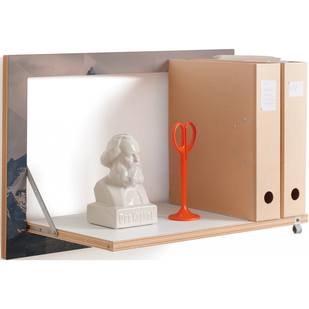 Das Mittlere. Das mittelgroße Fläpps Regal erfüllt gerne Standards. Im 3:2 Format gehalten versteht es sich bestens mit den kritischen Augen von Fotografen. Mit seinen schmalen 60cm super mit Einbauküchen. Aber natürlich auch mit dem allseits geliebten Leitzordner und all dem wofür Stabile Regale halt so gemacht sind... Maße: Eingeklappt 60 x 40 x 2 cm + 1 cm Wandhalterung, Regalfäche ausgeklappt 50 x 30 cm, Materialien: Sperrholz Birke beschichtet mit durchgefärbtem HPL, Edelstahl Belastbarkeit: 25 kg.