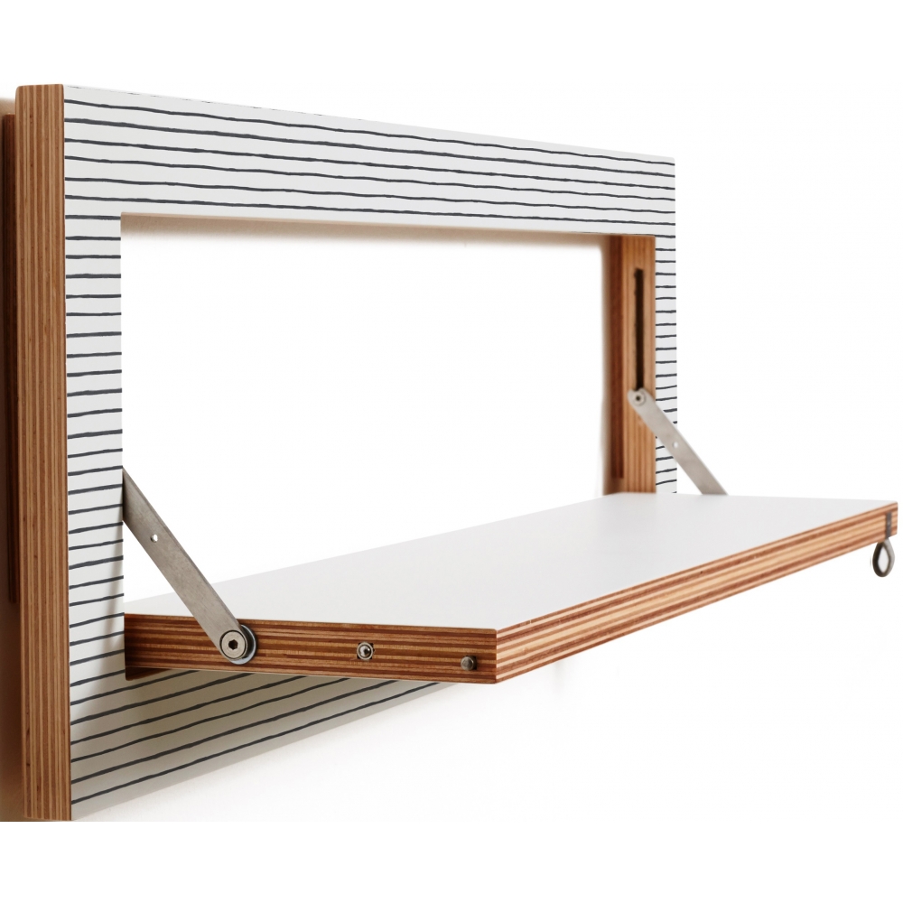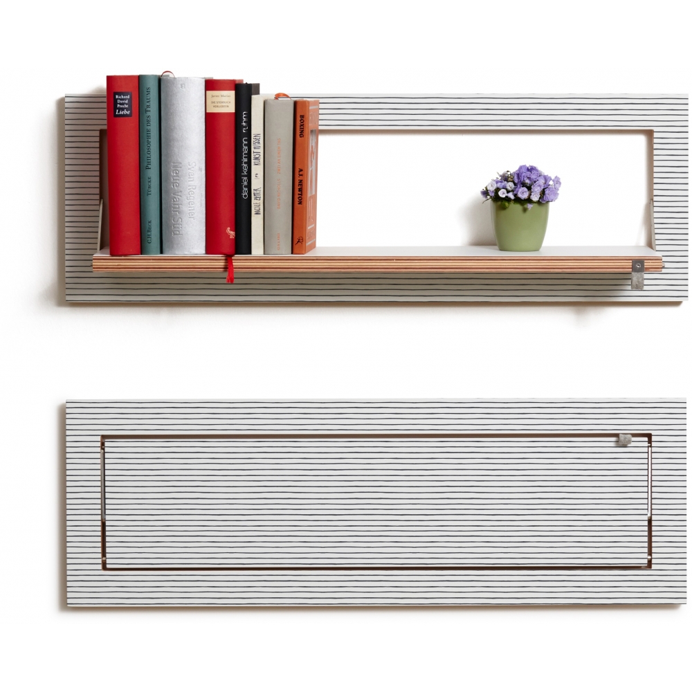 Das Schlanke. Reduzierter geht es nicht. Dieses schmale Bord treibt Compact Living auf die Spitze. Mit nur 27 cm Höhe passt es unter jede noch so niedrige Decke und in jeden noch so schmalen Flur. Zum Beispiel als auffallend zurückhaltender Platz für Lieblingsbücher. Auch für Lesemuffel. Maße: Eingeklappt 80 x 27 x 2 cm + 1 cm Wandhalterung, Regalfäche ausgeklappt 70 x 17 cm, Materialien: Sperrholz Birke beschichtet mit durchgefärbtem HPL, Edelstahl Belastbarkeit: 25 kg.