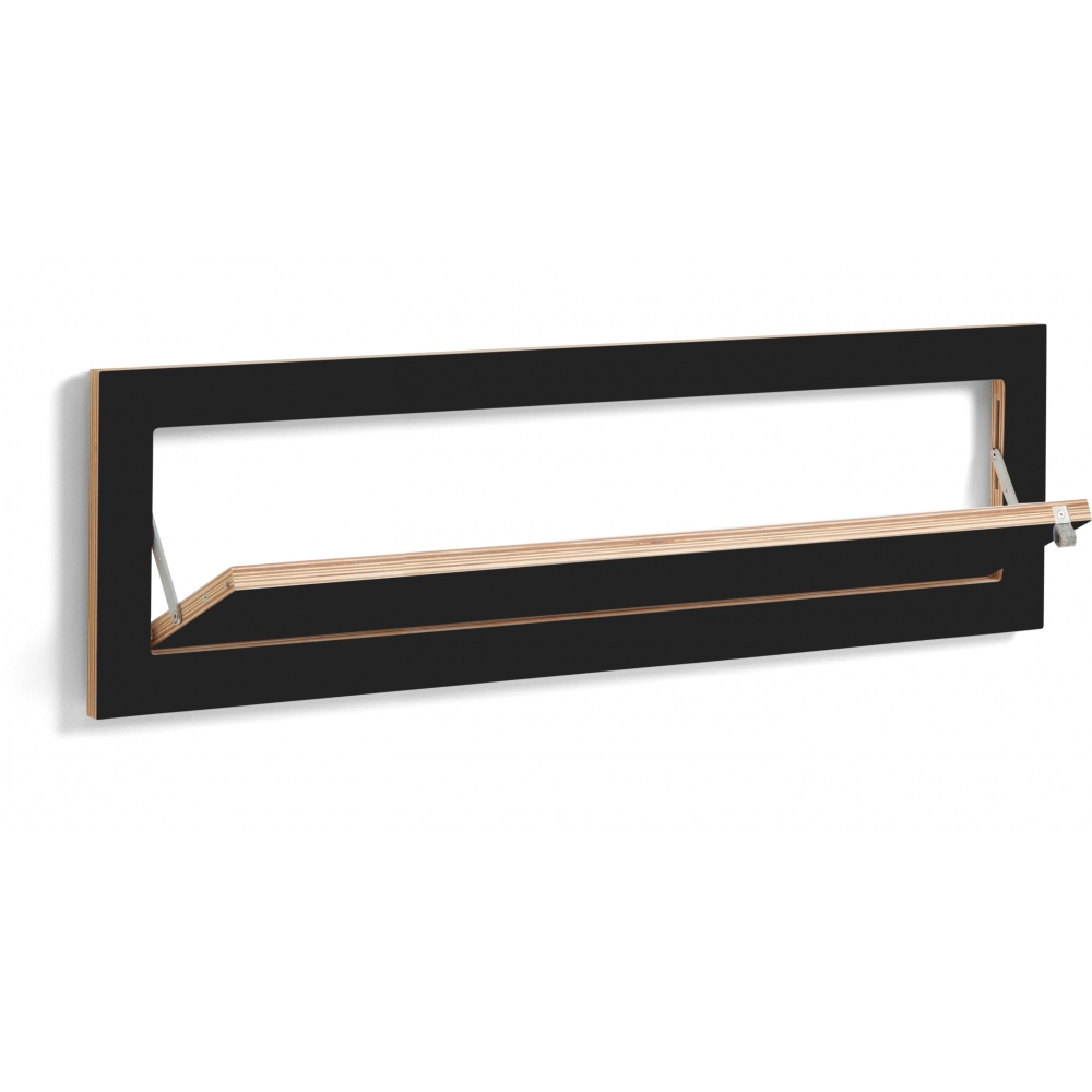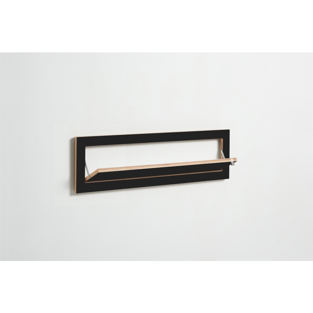 Um Schuhbergen unter der Garderobe ein Ende zu bereiten, lassen sich nun alle Fläpps Wandregale mit geringer Tiefe durch einen einfachen Trick in ein Schuhregal verwandeln. Durch Einsetzen von kleinen Magnetstiften in die Führungsschienen der Scharniere, öffnen sich die Klappen der Regale nur noch um 45 Grad und ermöglichen so ein praktisches Verstauen von Schuhen und anderen schräg- lagerbaren Dingen. Maße: Eingeklappt: 100 x 27 x 2 cm + 1 cm Wandhalterung, Regalfläche ausgeklappt: 90 x 16 cm, Materialien: Sperrholz Birke beschichtet mit durchgefärbtem HPL, Edelstahl, Belastbarkeit: 25 kg.
