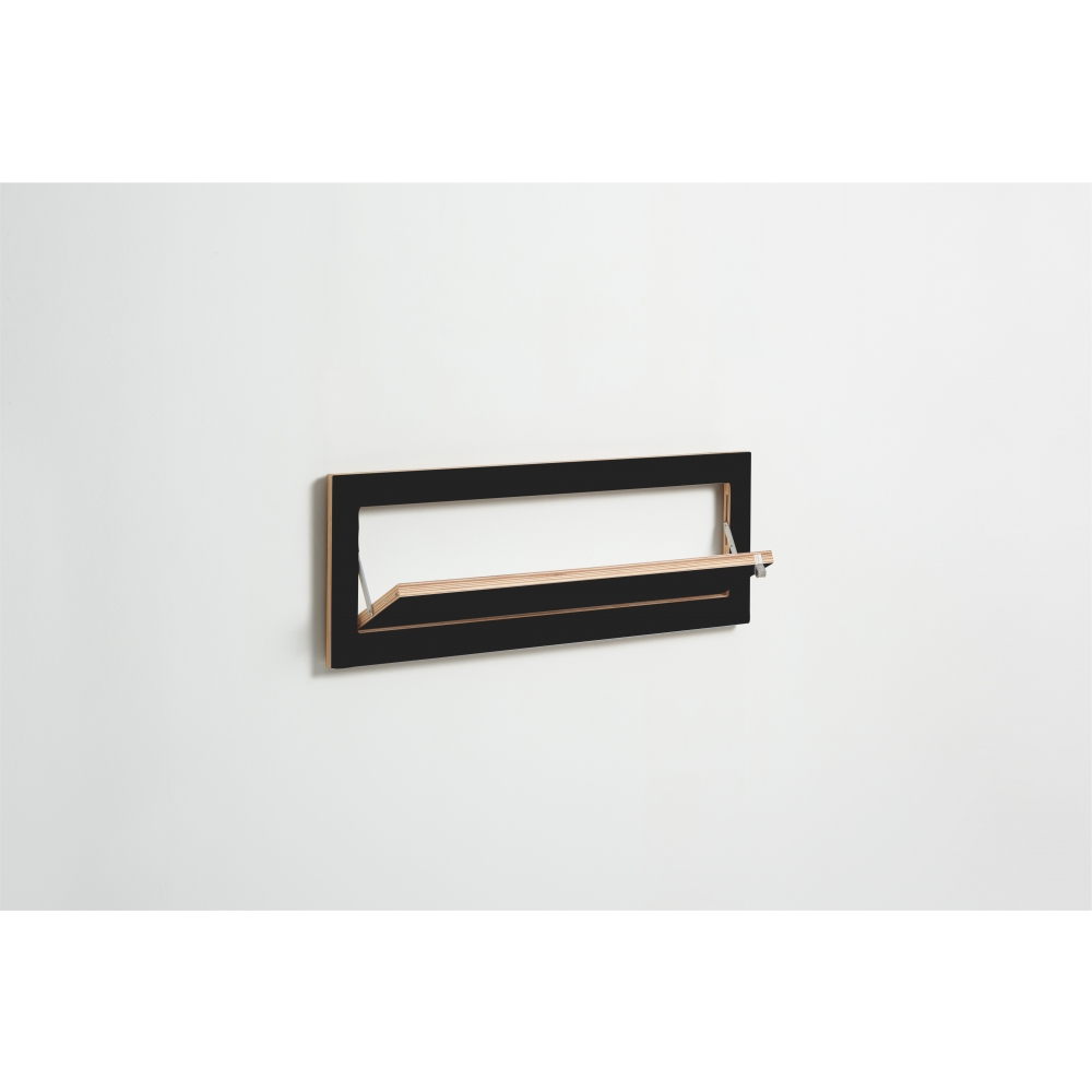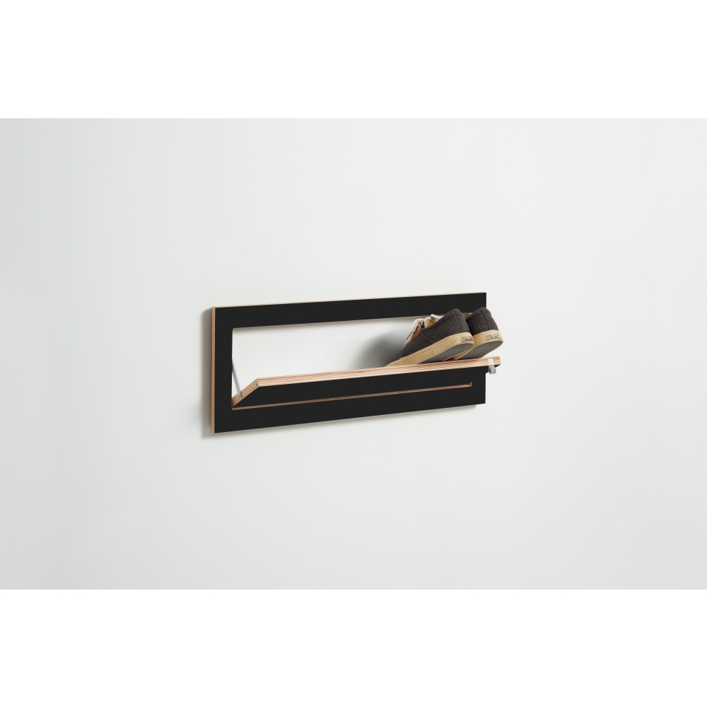 Um Schuhbergen unter der Garderobe ein Ende zu bereiten, lassen sich nun alle Fläpps Wandregale mit geringer Tiefe durch einen einfachen Trick in ein Schuhregal verwandeln. Durch Einsetzen von kleinen Magnetstiften in die Führungsschienen der Scharniere, öffnen sich die Klappen der Regale nur noch um 45 Grad und ermöglichen so ein praktisches Verstauen von Schuhen und anderen schräg lagerbaren Dingen. Maße: Eingeklappt: 60 x 27 x 2 cm + 1 cm Wandhalterung, Regalfläche ausgeklappt: 50 x 16 cm, Materialien: Sperrholz Birke beschichtet mit durchgefärbtem HPL, Edelstahl, Belastbarkeit: 25 kg.