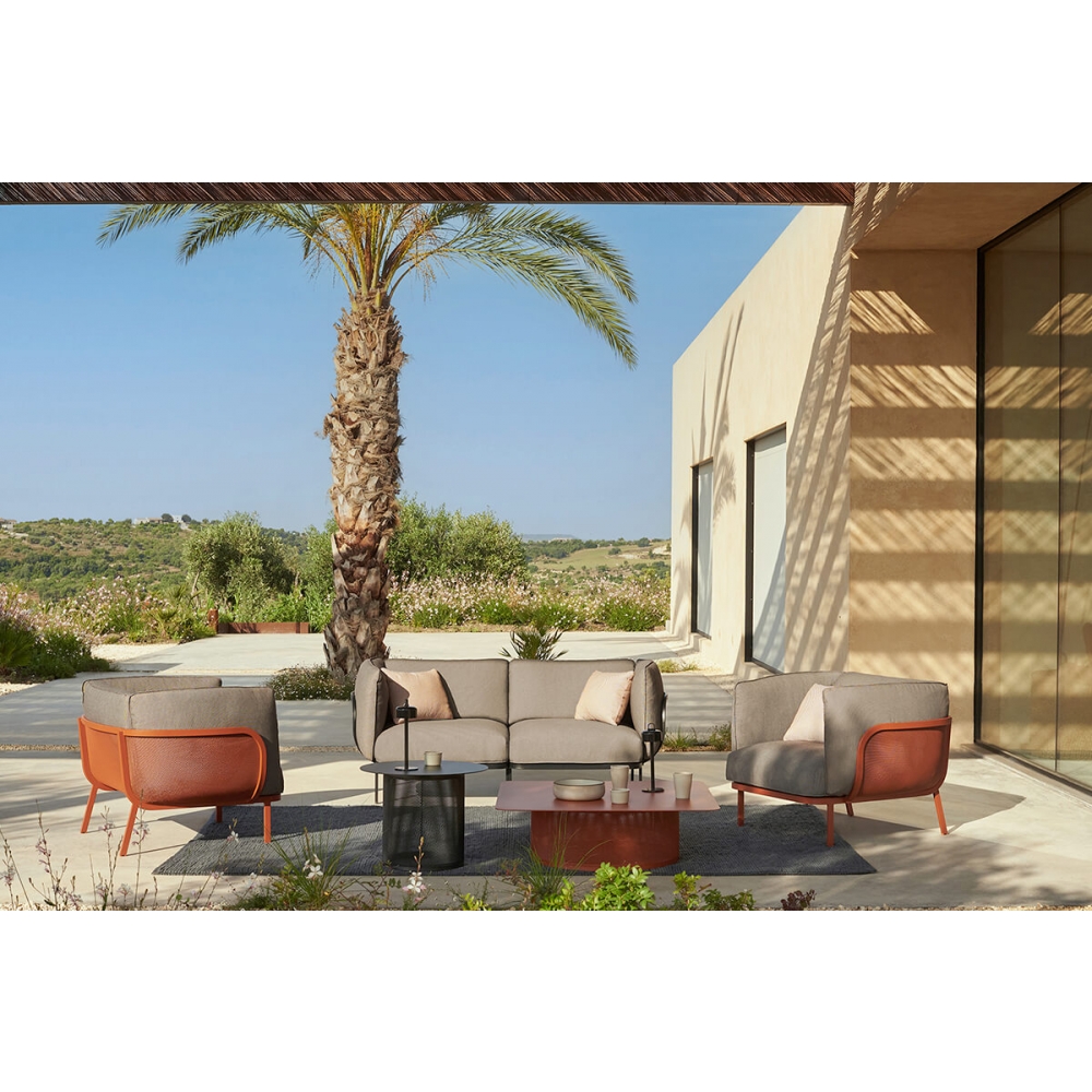 Cabla, Design von Lucidi-Pevere, ist ein Polstersystem aus nur 3 Modulen - gerade Einzelsitzreihe, Chaiselongue und Armstütze-, mit denen man viele Konfigurationen zusammenstellen kann. Der Metallkern des Edelstahlgestells, entwickelt auf Basis des in vielen Jahren Erfahrung angereicherten Wissens von EMU, vereint sich mit dem Komfort und der Farbenvielfalt der Outdoorstoffe, die eine maximale Kompositions- und Ausdrucksanpassungsfähigkeit in den unterschiedlichsten Kontexten, auch für Yachten und Booten, gewährleisten. Die Kollektion wird von einem Couchtisch aus einem Metallnetz in verschiedenen Formen und Größen, der mannigfache Lösungen für gesellige Kontexte bietet, ergänzt.