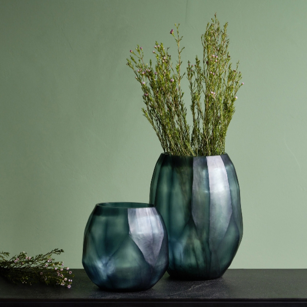 Wie aus Wachs geschnitzt wirkt die mundgeblasene Vase Boccioni. Unwillkürlich verspürt man den Drang, das in tiefen Edelsteinfarben gefärbte Glas berühren zu wollen,und die von Hand geschliffene weiche, satinierte Oberfläche zu erkunden. In großflächig archaischer Manier geformt, bieten sie einen Blickfang auch schon ohne