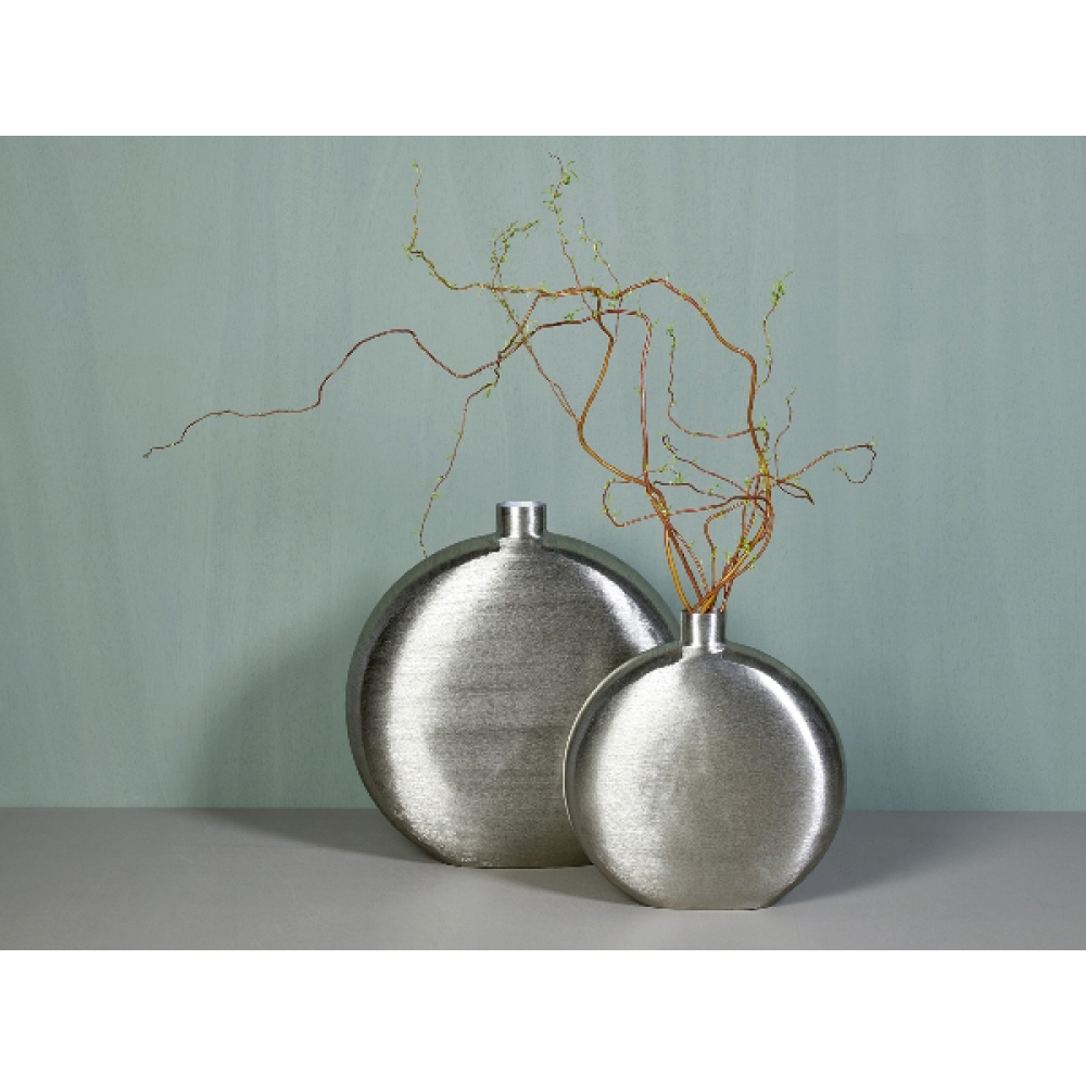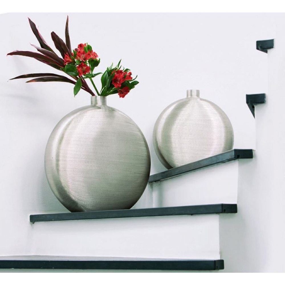 In handwerklicher Technik wurden die üppigen Formen der Botero Vase von Hand in Ihre Form getrieben. Die Oberfläche ist mit sehr grobem Schleifpapier und Schleifstein bewusst unregelmäßig schraffiert um die Form gestalterisch zu unterstützen. Botero eignet sich vornehmlich als dekoratives Gefäß im Wohnbereich. Wasser sollte nicht über einen langen Zeitraum im Gefäß stehen bleiben, weil es sich durch die enge Öffnung bedingt nicht leicht reinigen lässt und es zu Korrosion kommen kann.