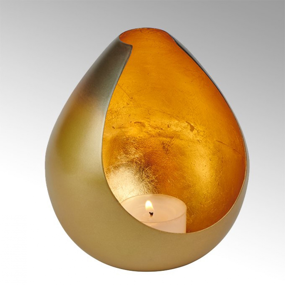 Kostbar und sehr romantisch muten die Cadis-Windlichter an. Die Tropfenform ist aus Eisen handgetrieben und von innen mit feinen goldfarbenen Metallblättern nach alter Vergoldungstechnik belegt. Cadis sollte nicht Wind und Wetter ausgesetzt bleiben, da die Oberfläche darunter leiden könnte.