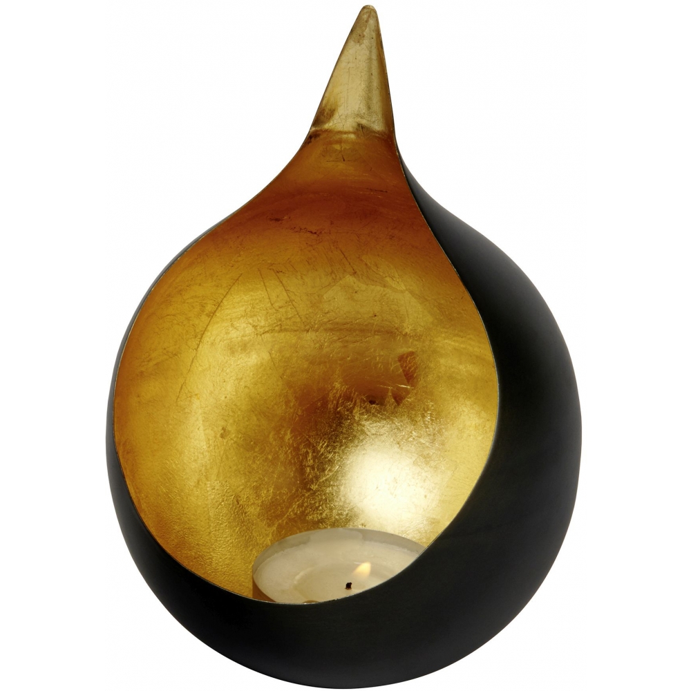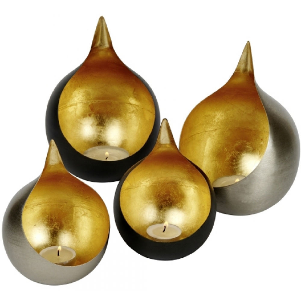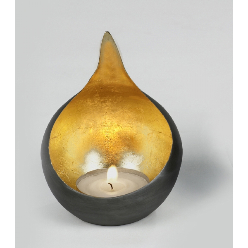Kostbar und sehr romantisch muten die Caldera-Windlichter an. Die Tropfenform ist aus Eisen handgetrieben und von innen mit feinen goldfarbenen Metallblättern nach alter Vergoldungstechnik belegt. Außen wird das Windlicht edel vernickelt und von Hand gebürstet, so dass feine Linien entstehen. Caldera sollte nicht Wind und Wetter ausgesetzt bleiben, da die edle Blattgoldoberfläche darunter leiden koennte. Das Gold schimmernde Licht verleiht jedem Abend die richtige romantische Stimmung.