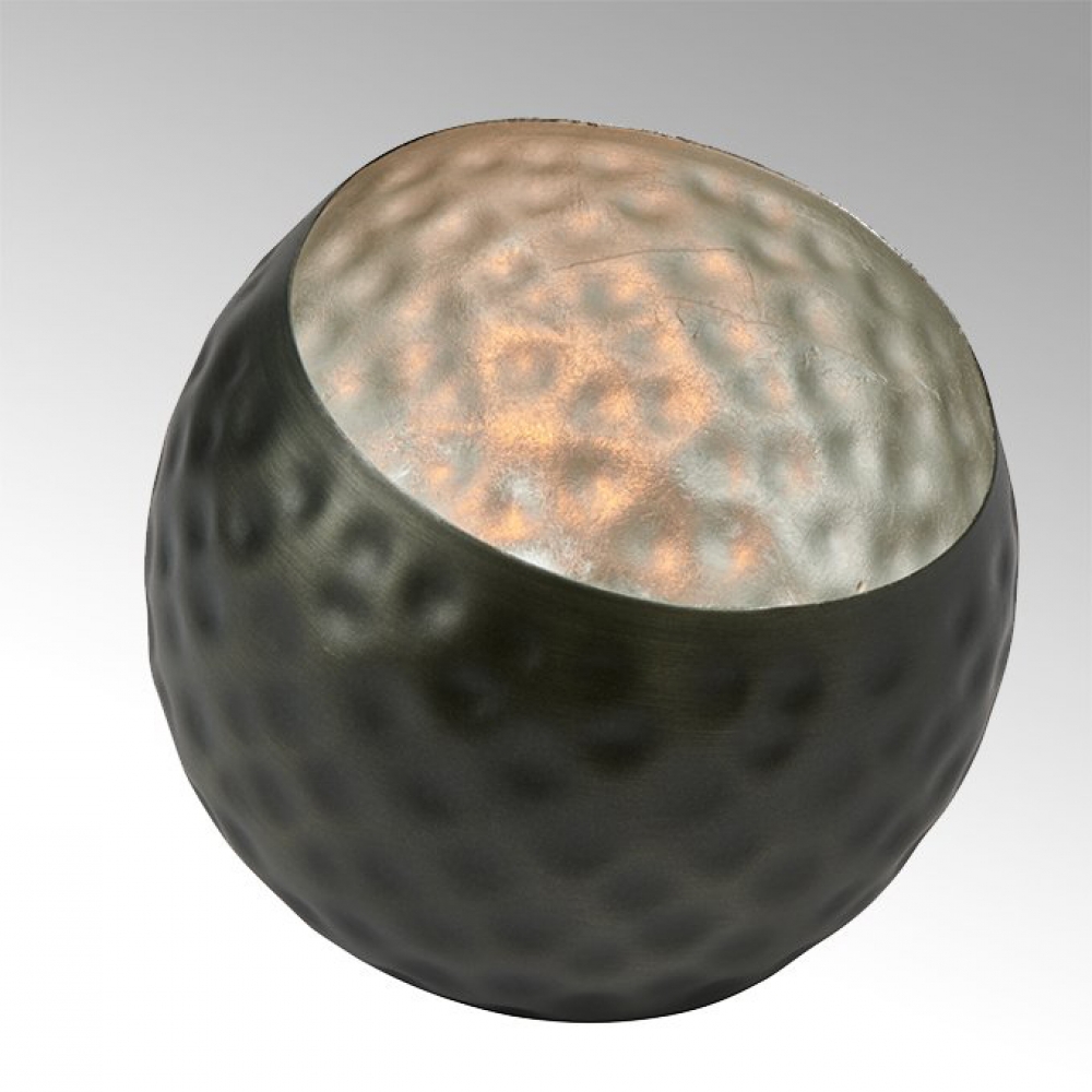 Das Cami-Windlicht ist mit seiner gehämmerten Oberfläche ein kleiner Hingucker. Von innen ist es mit feinen silberfarbenen Metallblättern nach alter Vergoldungstechnik belegt. Cami sollte nicht Wind und Wetter ausgesetzt bleiben, da die Oberfläche darunter leiden könnte.