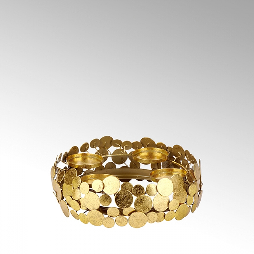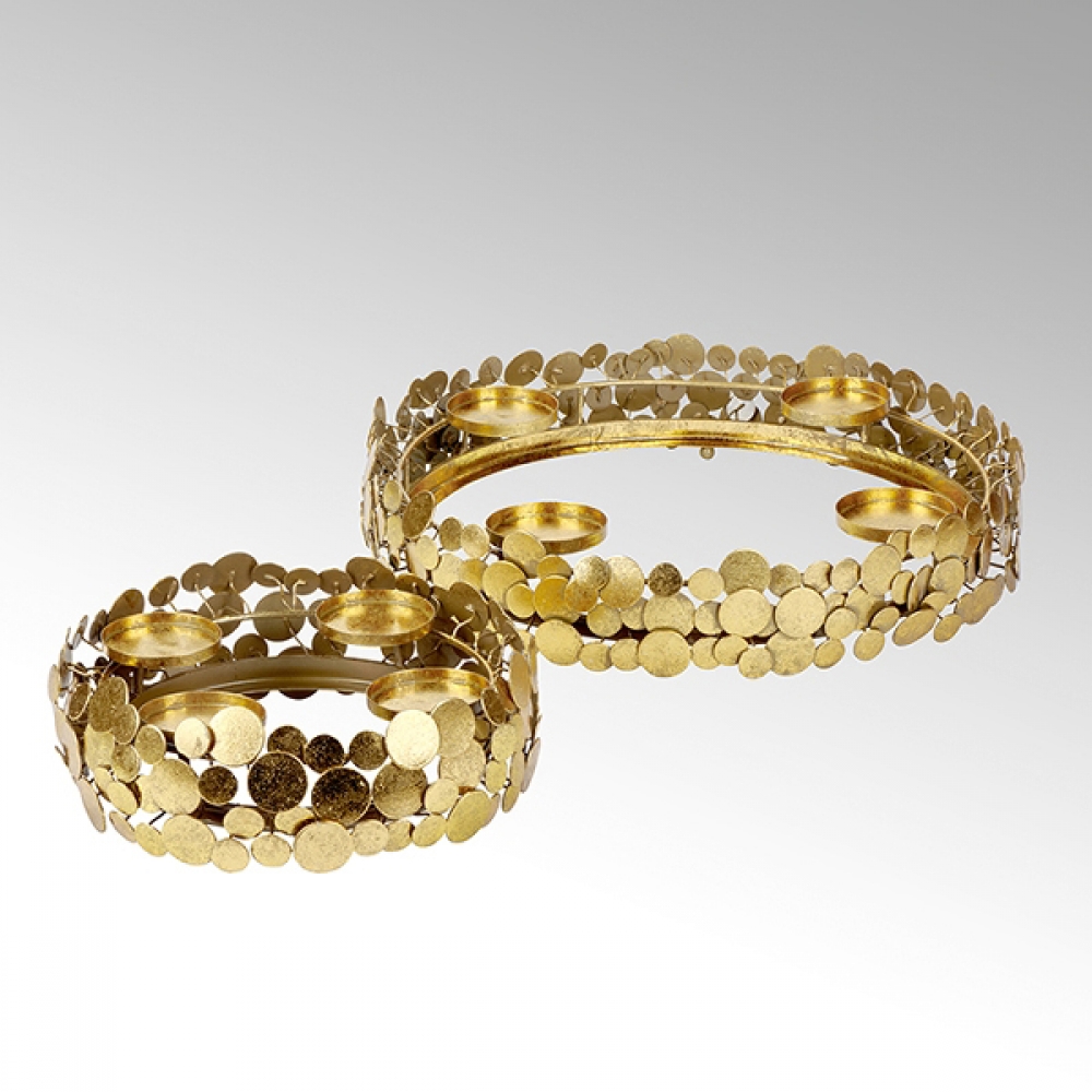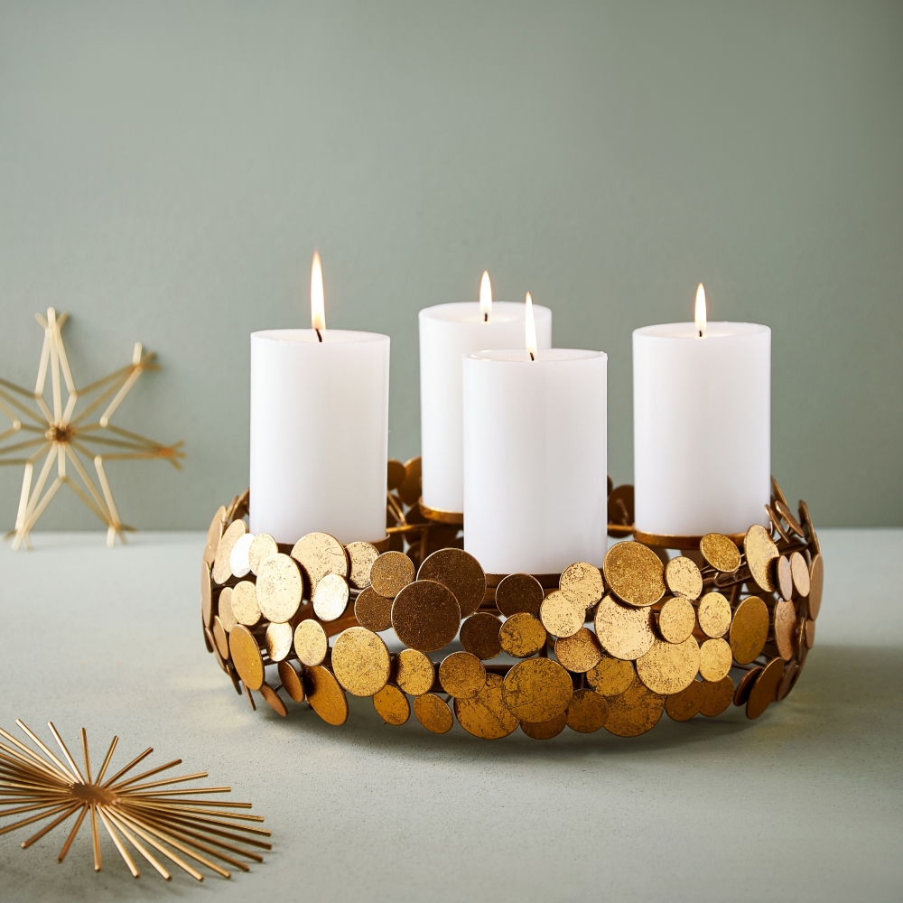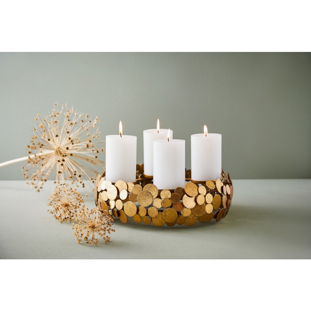 Der romantisch verspielte Kranz mit seinen großzügigen Proportionen ist nicht nur zur Adventszeit ein besonderer Schmuck für die Tafel. Auch zu anderen Gelegenheiten mit ein paar frischen Efeublättern oder mit Blüten dekoriert, setzt er die festliche Tafel ins richtige Licht. Jimin wird in einer kleinen und besonderen Manufaktur hergestellt. Die unterschiedlich großen, runden Plättchen werden mit einer metallpigmentierten Farbe von Hand bearbeitet wodurch ein besonders weicher, unaufdringlicher Goldglanz entsteht. Die sensible Oberfläche sollte zur Reinigung nur mit einem weichen, feuchten Tuch behandelt werden, schleifende Mikrofasertücher oder scharfe Gegenstände und Reinigungsmittel dürfen nicht eingesetzt werden. Kerzenwachs kann vorsichtig mit warmem Wasser und einem weichen Tuch entfernt werden.