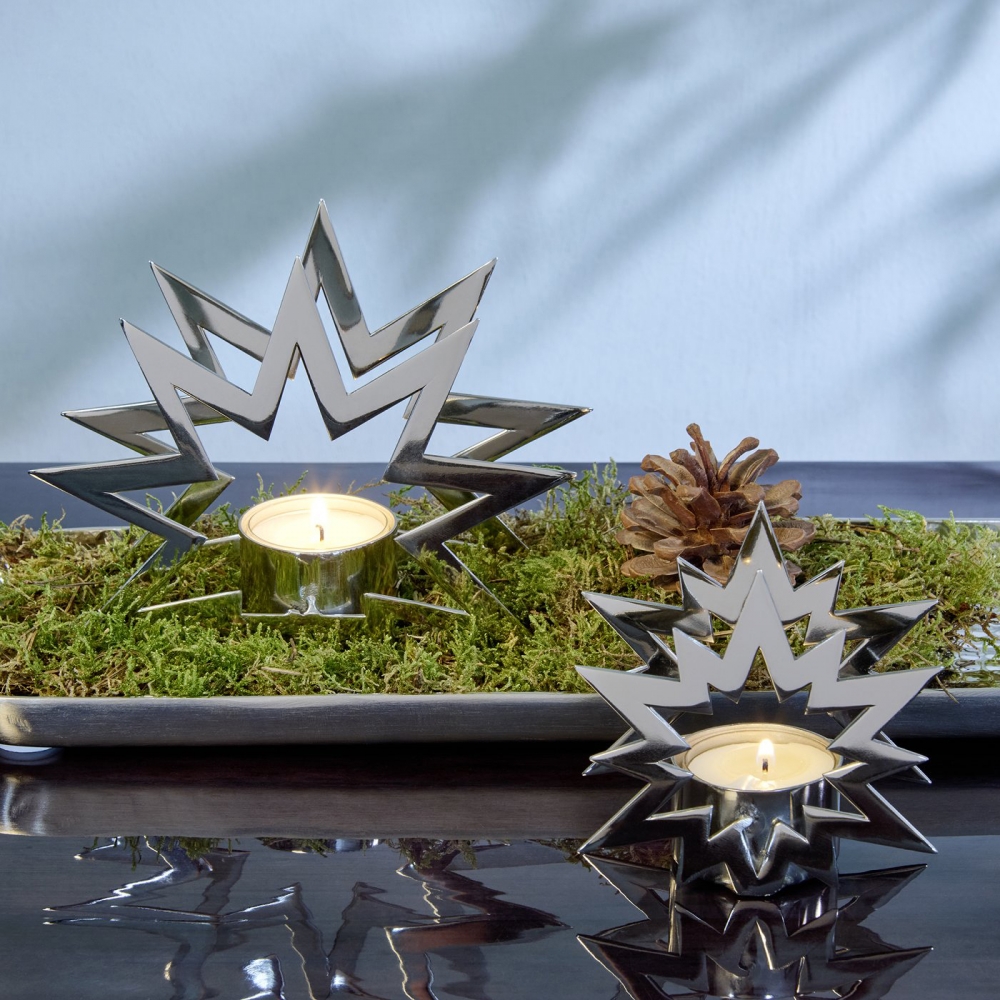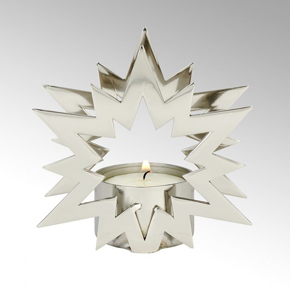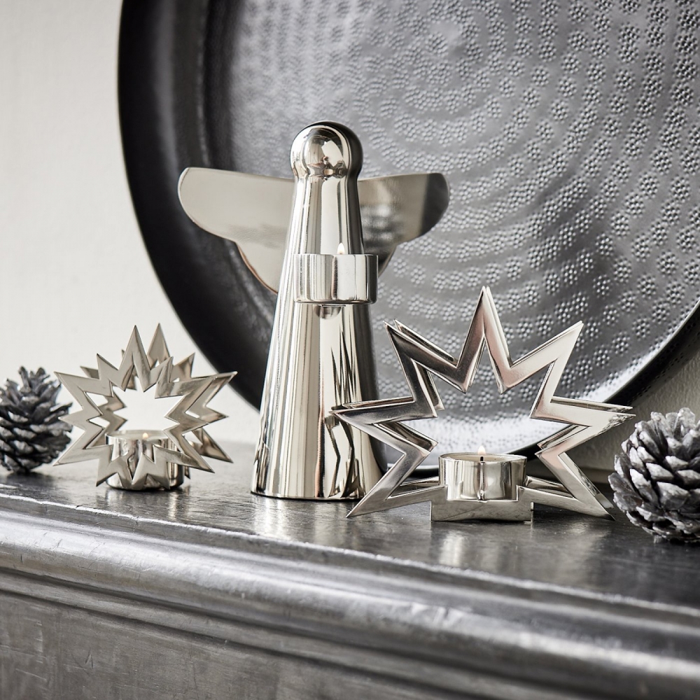 Die Sternenform verleiht dem Nova Teelichthalter ein festliches Erscheinungsbild und bringt mit stimmungsvollem Kerzenschimmer Wärme in die Weihnachtszeit. Mit dem matten Gold oder der glänzenden Nickel Oberfläche ein zeitloses Accessoire. Wachsreste dürfen nicht mit scharfen Gegenständen entfernt werden, die zerkratzen die sensible Oberfläche. Es empfiehlt sich, warmes Wasser, etwas Spülmittel und einen weichen Lappen hierfür zu nutzen.