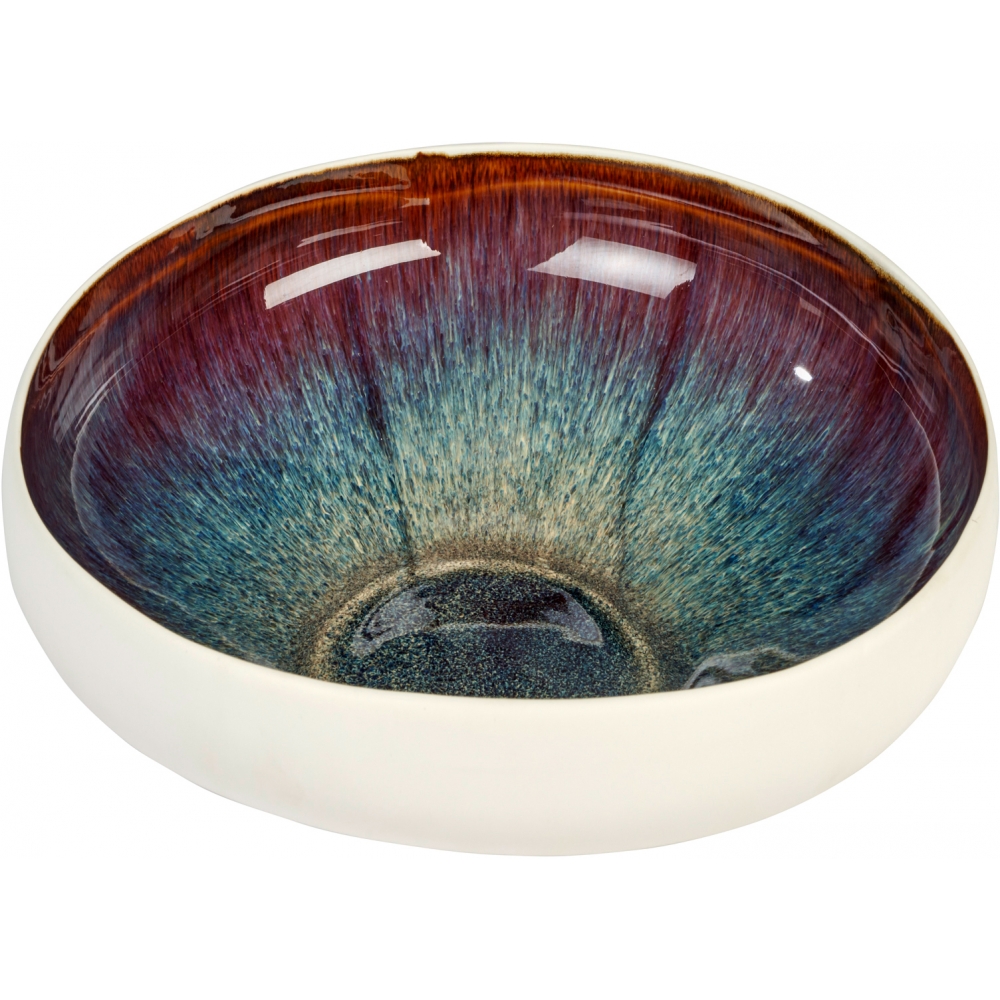Das Takeo Geschirr ist elegant und alltagstauglich. Die hochgebrannte Keramik ist zwar fein aber dennoch stabil. Das Geschirr ist außen mit einer feinen Mattglasur versehen und zeigt sein Innenleben mit einer aufregend gefärbten und individuell verlaufenden Reaktivglasur. Die besondere Eigenschaft einer Reaktivglasur besteht in ihrem unregelmäßigen Verlauf. Ausgelöst durch der Glasur beigefügte unterschiedliche Mineralien, ergeben sich im Brand individuelle Farbverläufe die die Oberfläche interessant gestalten und jedes Teil zu einem Unikat machen. Takeo ist spülmaschinengeeignet. Metallbesteck kann Abrieb außen auf der hellen Mattglasur hinterlassen, die mit einem weißen oder transparenten Radiergummi wieder entfernt werden kann.