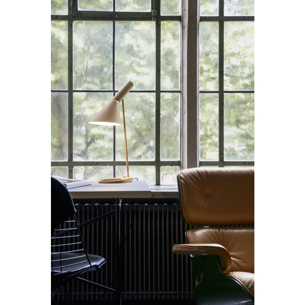 Die AJ Leuchte wurde 1957 für das SAS Royal Hotel in Kopenhagen entworfen und ist ein legendäres Design von Arne Jacobsen. Das Design ist grafisch und stilrein in seinem Ausdruck, was ihm einen zeitlosen Look verleiht, der sich für verschiedene Farbtöne entsprechend den modernen Einrichtungstrends eignet. Die AJ Tischleuchte sorgt für ein nach unten gerichtetes Licht. Die Neigung des Schirms kann an die Bedürfnisse der Anwender angepasst werden. Der Schirm ist auf der Innenseite weiß lackiert, wodurch ein gleichmäßiges, weiches Licht erzeugt wird.