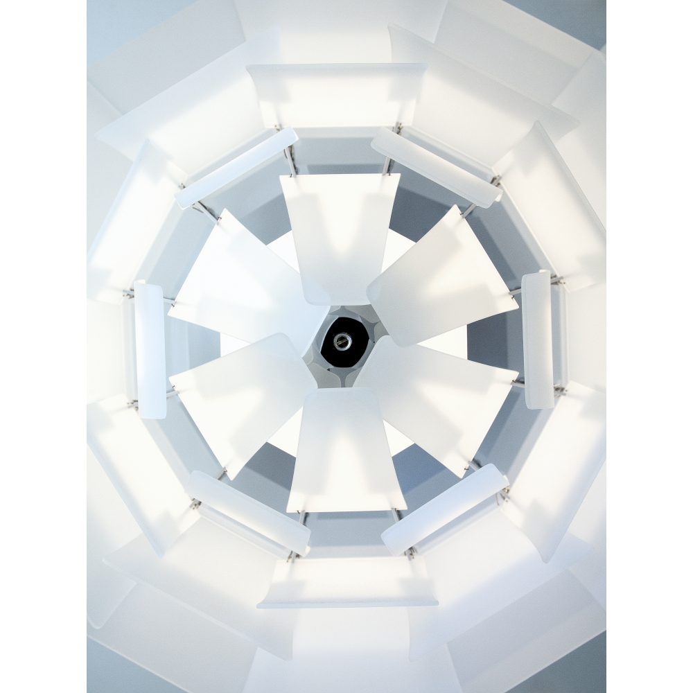 Material Blätter: Gestanzter, lackierter Stahl; Oberschirm: Gezogener Stahl; Verbindungsstäbe: Stahl, lasergeschnitten, hochglanzverchromt; Gehäuse: Gezogenes Aluminium, hochglanzverchromt