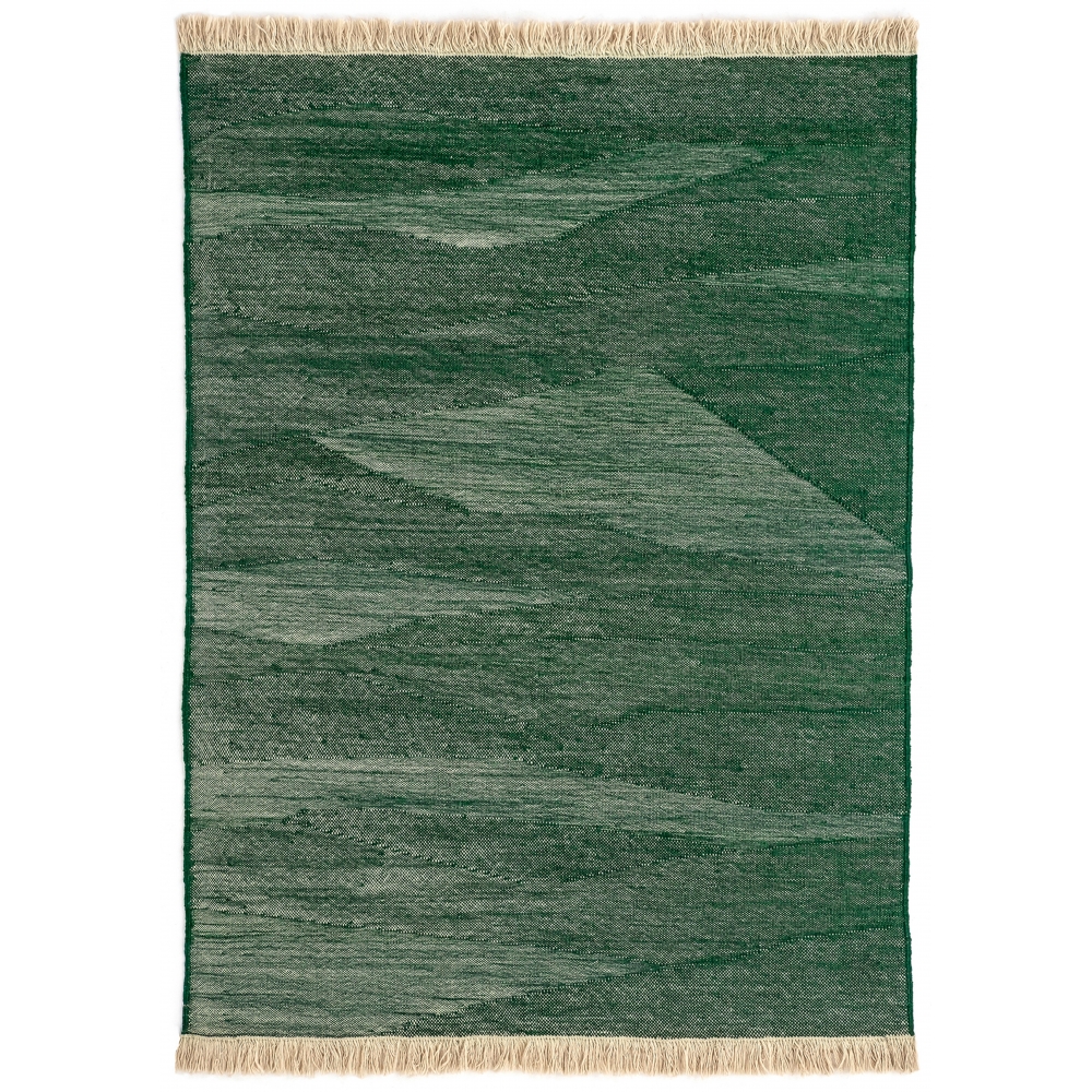 Diese Kollektion entstand aus der ständigen Suche nach neuen Ansätzen, die der Webstuhl zu bieten hat. Durch die Kombination der Techniken, die in Kelims und typischen Dhurries verwendet werden, haben wir durch die Variation und den Druck der Fasern einen einzigartigen Satz von Texturen und Rhythmen geschaffen. Die Änderungen im Muster, die sich aus der Spannung zwischen Schuss und Kette ergeben, verleihen dem Teppich ein nuanciertes Aussehen und rufen so die wichtigste manuelle Arbeit hervor: den beharrlichen Versuch und Irrtum des Handwerkers, aus dem magische Ergebnisse hervorgehen. Telares hat viel Vorarbeit und Prototyping benötigt, um die gewünschte Textur zu finden. Das Ergebnis ist ein lockerer Kelim mit gekrümmten Formen, im Gegensatz zu herkömmlichen Kelims, die normalerweise geometrisch und geradlinig sind. Es ist handgewebt mit afghanischer Wolle. Sein rustikales Aussehen und die Unregelmäßigkeiten der Wolle führen zu einem einzigartigen Teppich, auf dem Sie die Schönheit und Authentizität der Handwerkskunst schätzen können. Bemerkenswert sind die lockigen Ränder. Jedes Modell ist in 5 Farben erhältlich und sucht eine Reihe von Kontrasten mit der Kombination der charakteristischen natürlichen Farbe der afghanischen Wolle und einer Kontrastfarbe. Der CO2-Fußabdruck dieses Produkts wurde ausgeglichen. Im Jahr 2021 wurde Nanimarquina nach der Umsetzung nachhaltiger Strategien als erstes Unternehmen für klimaneutrale Teppiche zertifiziert. Diese Zertifizierung unterstreicht das Engagement des Unternehmens für verantwortungsvolle Praktiken in allen Aspekten seiner Geschäftstätigkeit für eine bessere Zukunft.