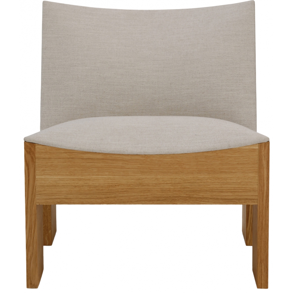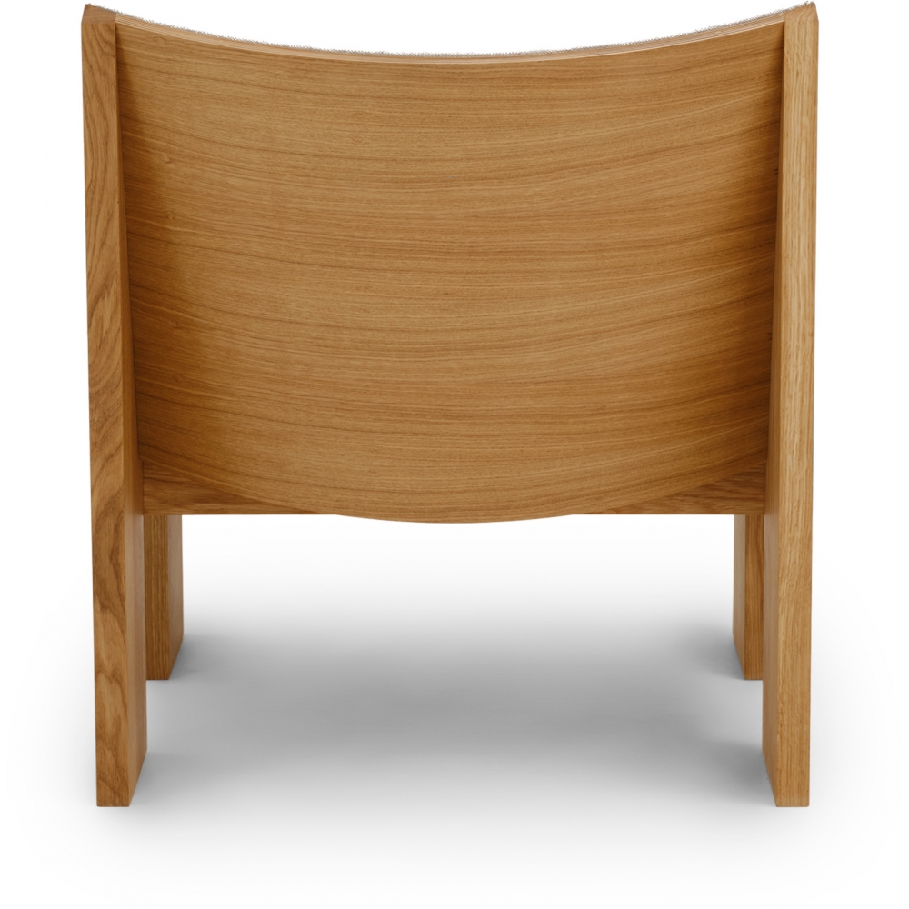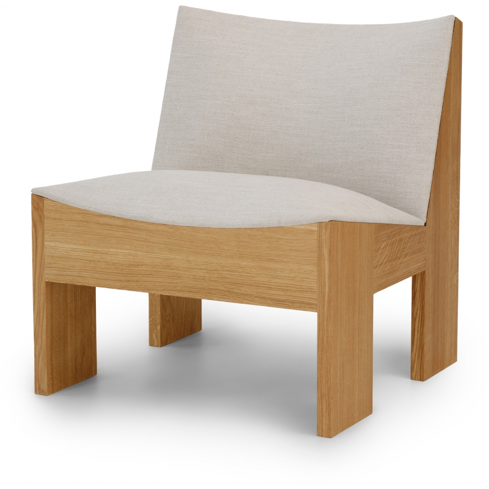 Trotz seiner geringen Abmessungen verfügt der Tenon Lounge Chair über einen ausdrucksstarken Charakter – hart und weich, stark und anmutig –, da er Kontraste zwischen hartem Holz und gepolsterten Oberflächen kultiviert. Eine klare Konstruktion aus massiver Eiche, die in einer sogenannten „Zapfen- und Zapfenverbindung“ zusammengefügt wird, schafft einen skulpturalen Rahmen für den Sitz. Die geraden Linien und die Robustheit des Rahmens bilden ein weicheres Gegenspiel aus federnden Kurven, wie ein Schutzschild, das einen weichen Kern schützt.