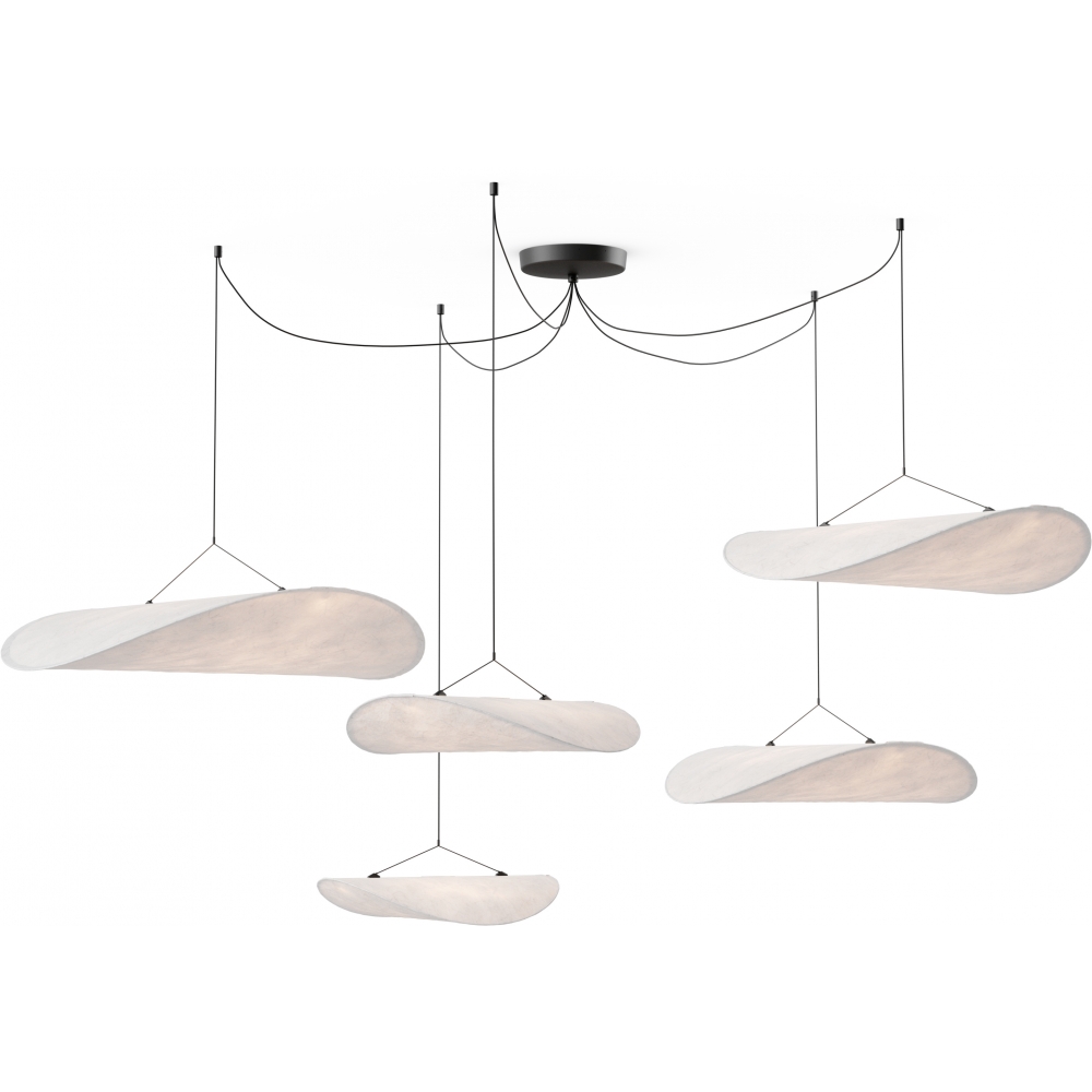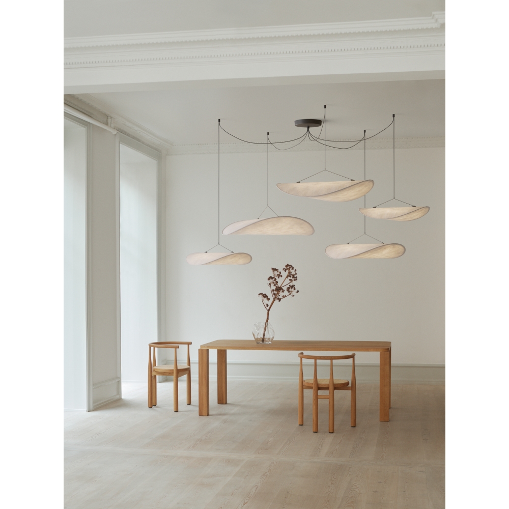Eine Wolke kommt selten allein. Tense Multi Canopy ermöglicht es, drei oder fünf Tense-Schirme, unabhängig von ihrer Größe, zu einem voluminösen und kontemplativen Arrangement zusammenzustellen. Der Baldachin fasst den Kabelausgang zusammen und verbirgt ihn, so dass der Blick auf den aufgehängten Schirmen und dem sanften, bezaubernden Licht, das von der Konstellation ausgeht, verweilt. Tense Multi Canopy eignet sich perfekt für weitläufige Räume wie Eingangshallen, hohe Wohnzimmer oder den gehobenen Bereich von Hotel- und Restaurantinterieurs und vermittelt Volumen und Atmosphäre.
