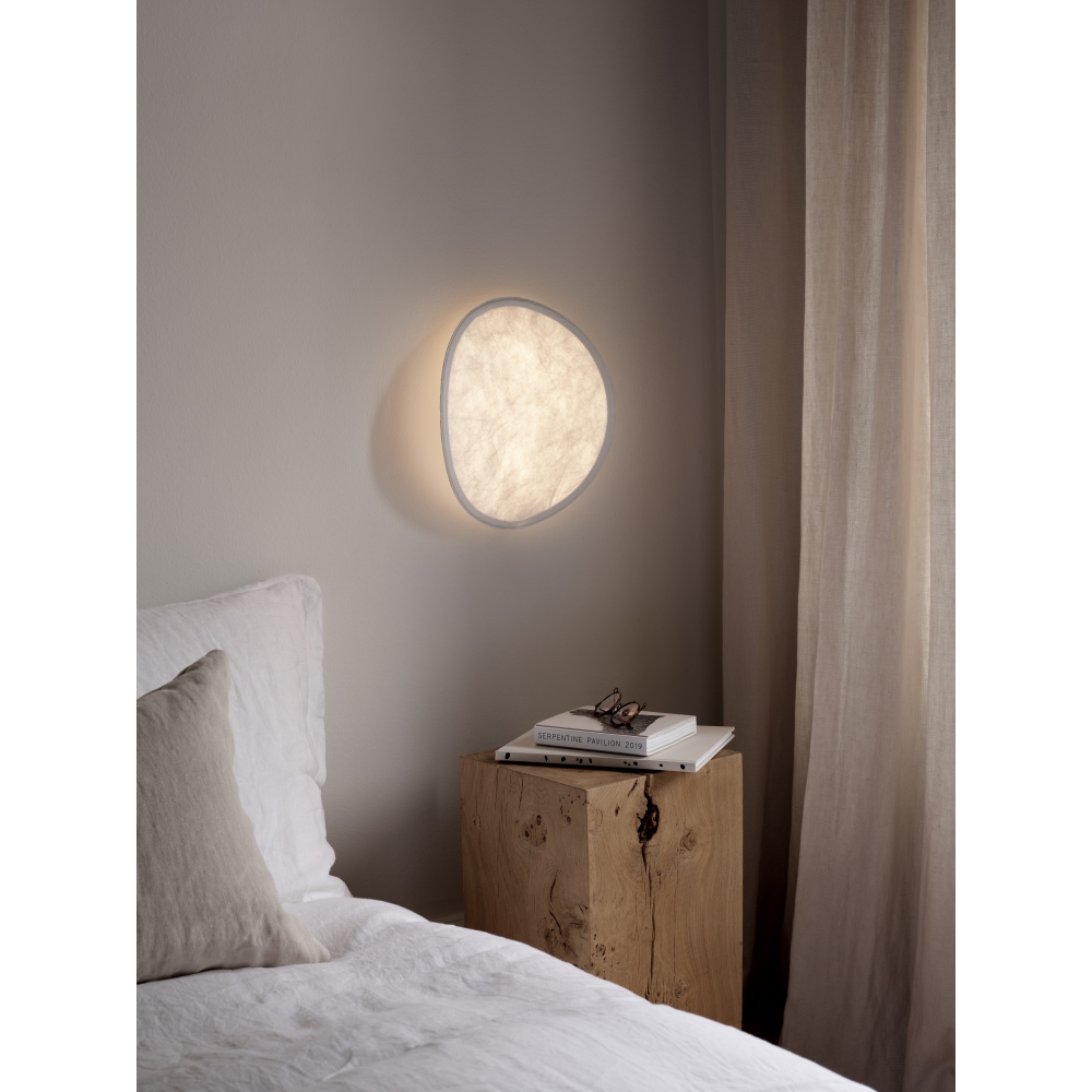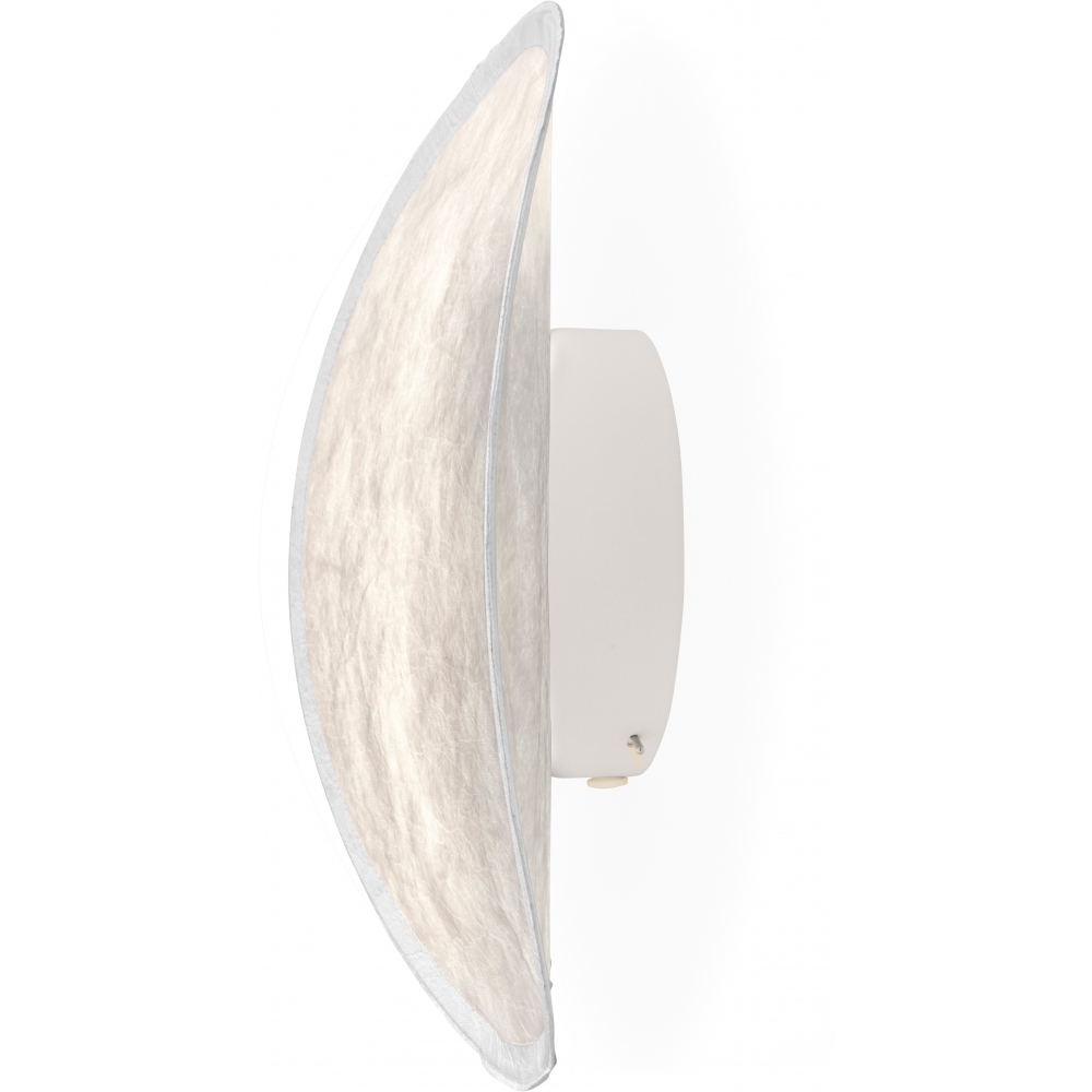 In ihrer Tense-Serie für New Works erforschen die Designer Panter & Tourron Aspekte der Materialspannung, die luftigen und fließenden Formen Leben einhauchen. Der verträumte, wolkenähnliche Schirm der Tense Wall Lamp streut das Licht sanft und erzeugt ein skulpturales Gefühl, das zu einer Vielzahl von architektonischen Umgebungen passt. Mit seiner stoffähnlichen Weichheit und einem Ausdruck, der an knackiges Papier erinnert, bringt der texturreiche Tyvek-Diffusor Taktilität ins Spiel und bietet gleichzeitig Festigkeit, Flammschutz der Klasse 1 und 100%ige Recyclingfähigkeit. Wenn das Licht eingeschaltet ist, wird die zerknitterte Textur in einem delikaten Wechselspiel von Licht und Schatten akzentuiert. Die Tense Wall Lamp ist mit einer integrierten LED-Lichtquelle und einem diskreten Stiftschalter an der Basis ausgestattet.