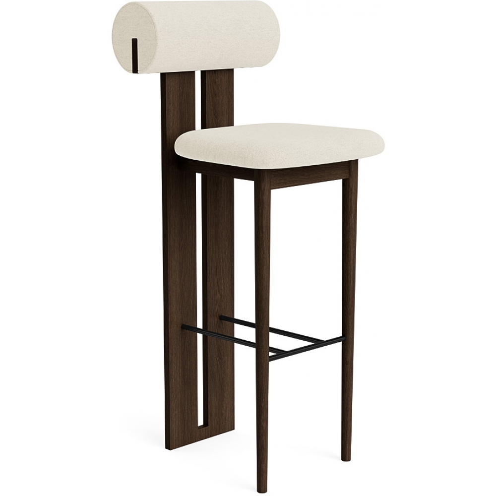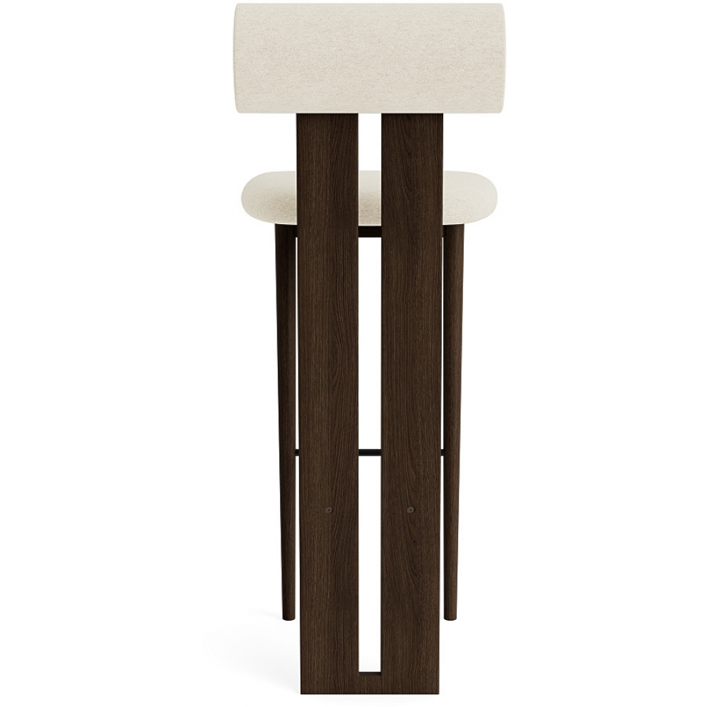 Der Hippo Barhocker ruht auf zwei stabilen Holzbeinen, die Sitz und Rückenlehne nahtlos miteinander verbinden, und ist eine Barversion des kultigen Hippo Chair | Full Upholstery. Das markante Holzprofil wirkt wie ein fast architektonisches Element, das in starkem Kontrast zu der abgerundeten, weichen Rückenlehne und Sitzfläche steht und Hippo Bar von hinten genauso schön macht wie von vorne.