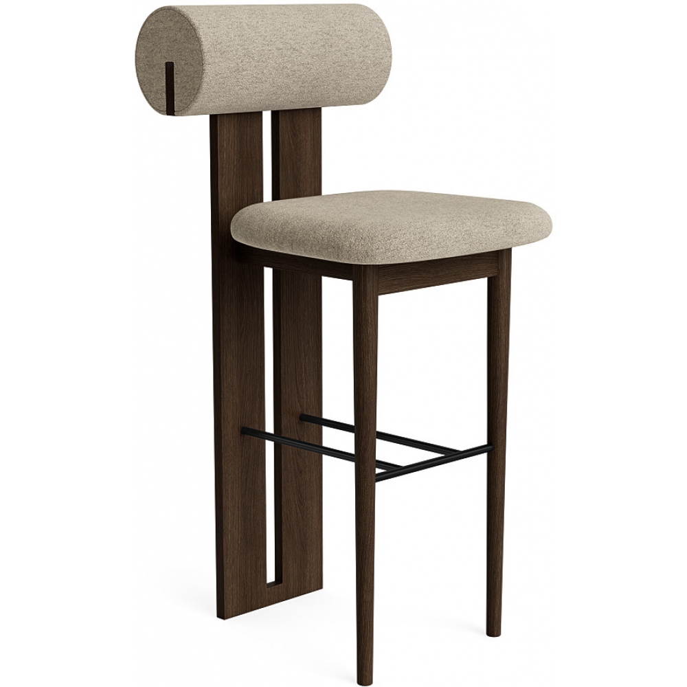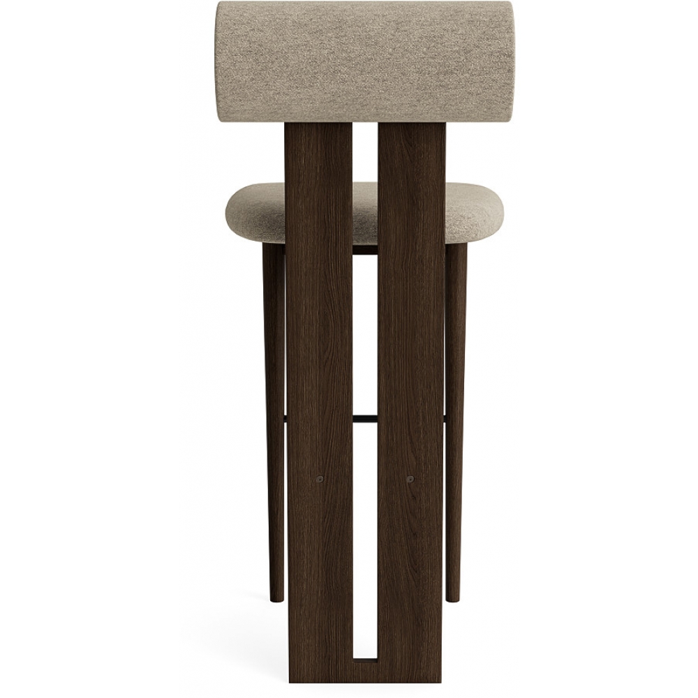 Der Hippo Counter Hocker ruht auf zwei stabilen Holzbeinen, die Sitz und Rückenlehne nahtlos miteinander verbinden. Er ist die Gegenversion des kultigen Hippo Chair | Full Upholstery. Das markante Holzprofil wirkt wie ein fast architektonisches Element, das in starkem Kontrast zu der abgerundeten, weichen Rückenlehne und Sitzfläche steht und den Hippo Counter Chair von hinten genauso schön macht wie von vorne.