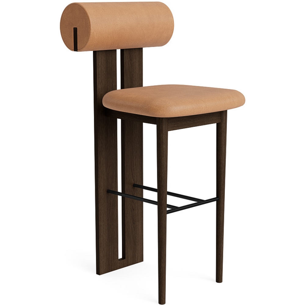 Der Hippo Counter Hocker ruht auf zwei stabilen Holzbeinen, die Sitz und Rückenlehne nahtlos miteinander verbinden. Er ist die Gegenversion des kultigen Hippo Chair | Full Upholstery. Das markante Holzprofil wirkt wie ein fast architektonisches Element, das in starkem Kontrast zu der abgerundeten, weichen Rückenlehne und Sitzfläche steht und den Hippo Counter Chair von hinten genauso schön macht wie von vorne.