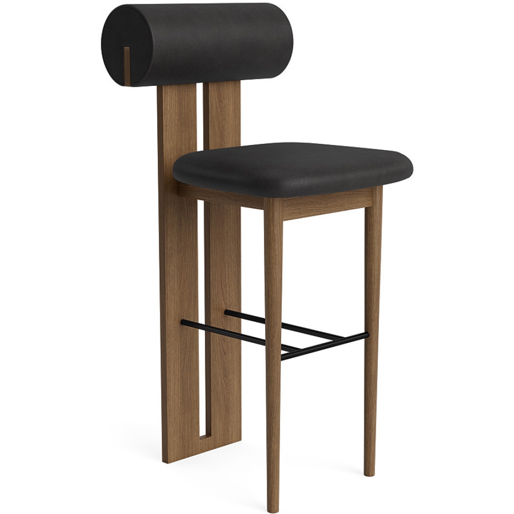 Der Hippo Counter Hocker ruht auf zwei stabilen Holzbeinen, die Sitz und Rückenlehne nahtlos miteinander verbinden. Er ist die Gegenversion des kultigen Hippo Chair | Full Upholstery. Das markante Holzprofil wirkt wie ein fast architektonisches Element, das in starkem Kontrast zu der abgerundeten, weichen Rückenlehne und Sitzfläche steht und den Hippo Counter Chair von hinten genauso schön macht wie von vorne.