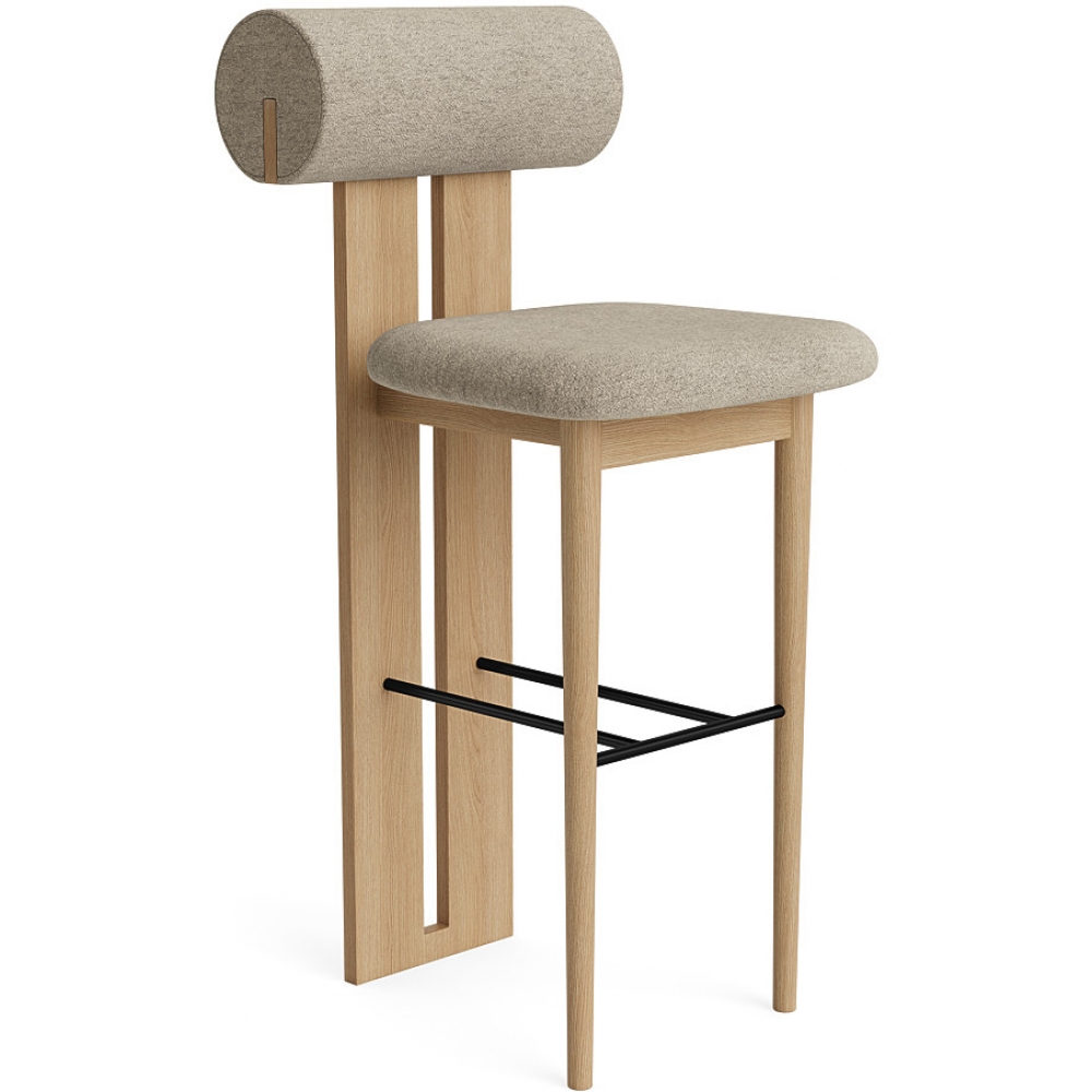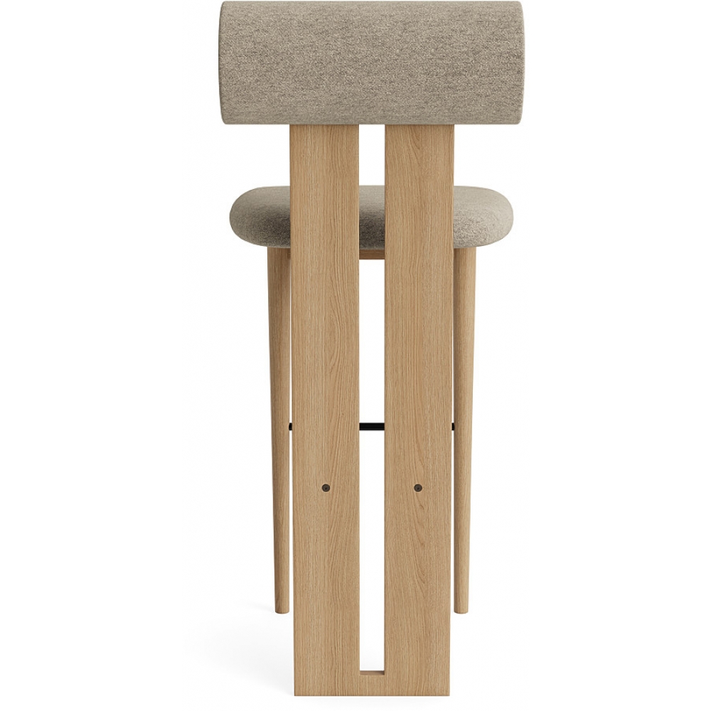 Der Hippo Counter Hocker ruht auf zwei stabilen Holzbeinen, die Sitz und Rückenlehne nahtlos miteinander verbinden. Er ist die Gegenversion des kultigen Hippo Chair | Full Upholstery. Das markante Holzprofil wirkt wie ein fast architektonisches Element, das in starkem Kontrast zu der abgerundeten, weichen Rückenlehne und Sitzfläche steht und den Hippo Counter Chair von hinten genauso schön macht wie von vorne.