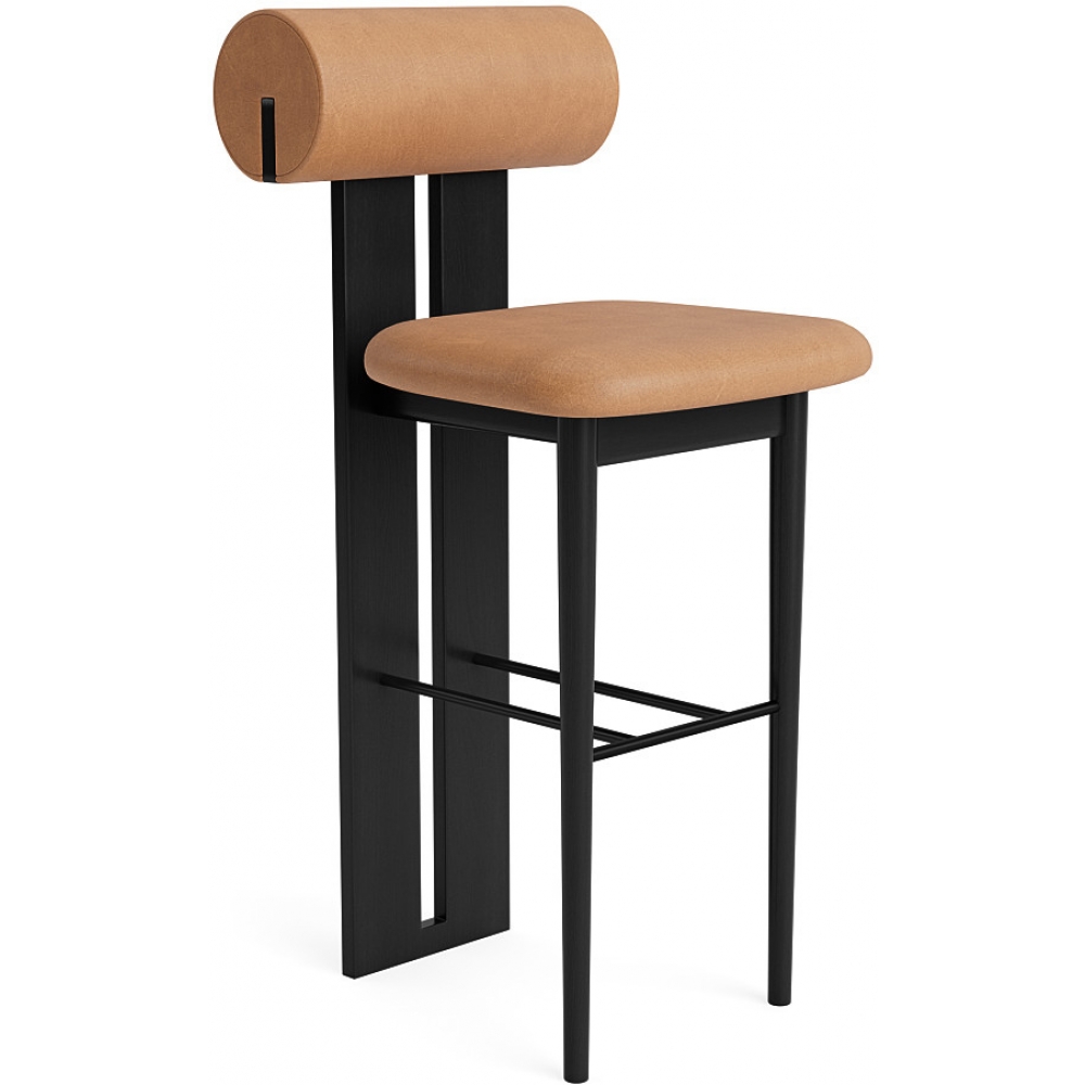 Der Hippo Counter Hocker ruht auf zwei stabilen Holzbeinen, die Sitz und Rückenlehne nahtlos miteinander verbinden. Er ist die Gegenversion des kultigen Hippo Chair | Full Upholstery. Das markante Holzprofil wirkt wie ein fast architektonisches Element, das in starkem Kontrast zu der abgerundeten, weichen Rückenlehne und Sitzfläche steht und den Hippo Counter Chair von hinten genauso schön macht wie von vorne.