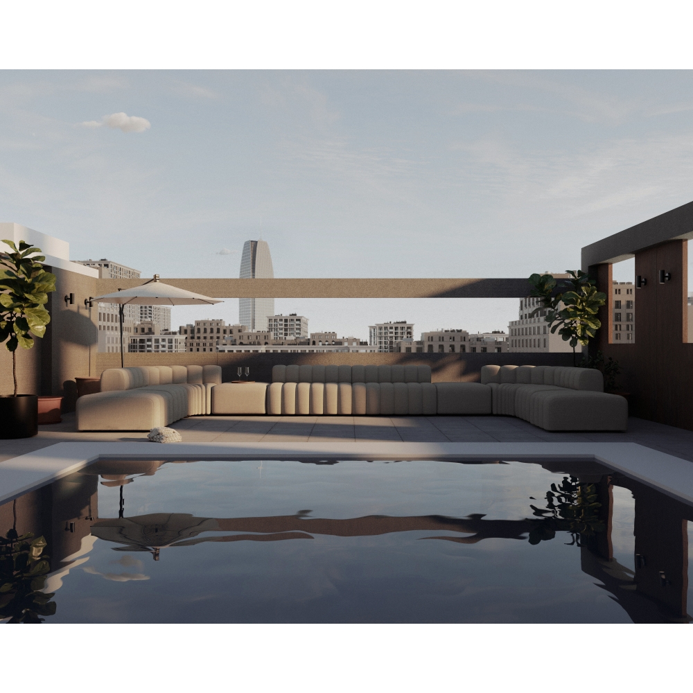 Das NORR11 Studio Sofa zieht nach draußen! Es bietet einen ruhigen und bequemen Platz, um sich zu entspannen und die Schönheit der Natur zu genießen. Ob Sie nun im Sonnenschein faulenzen oder den nächtlichen Sternenhimmel bewundern, diese Kollektion schafft eine ruhige Atmosphäre, die perfekt für eine magische Pause in der Zeit ist. Die Outdoor Lounge Collection ist aus Sunbrella gefertigt, einem hochwertigen Outdoor-Stoff, der für seine Langlebigkeit und Widerstandsfähigkeit bekannt ist. Dank ihrer Fähigkeit, den Elementen lange standzuhalten, ist diese Kollektion ideal für eine Vielzahl von Lounge-Bereichen im Freien, die robuste und wetterfeste Möbel erfordern.