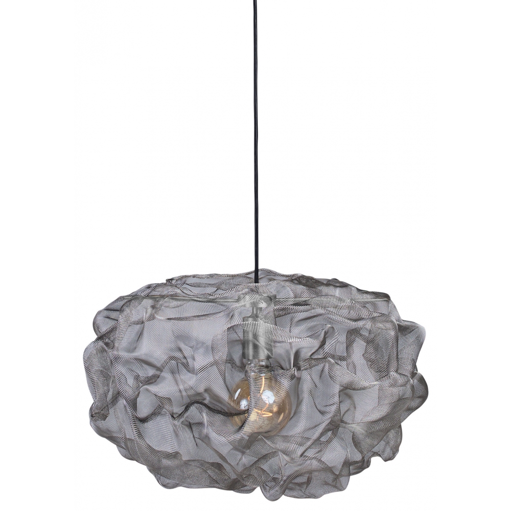 Mit ihrem subtilen Glanz und ihrer skulpturalen Oberfläche verwischt die Heat-Hängeleuchte die Grenzen zwischen Kunst und Design. Der ausschließlich aus Edelstahlgewebe gefertigte Schirm hat ein silbernes Aussehen, das beim Durchscheinen des Lichts zu schimmern scheint. Die Pendelleuchte verändert ihr Aussehen, wenn die Lichtquelle in ihrem Inneren zu leuchten beginnt. Wenn der Strom abgeschaltet ist, ähnelt die halbtransparente Form des Schirms einer silbernen Wolke, die über dem Raum schwebt. Die kleine Version ist in zwei Größen erhältlich und kann einzeln installiert oder zu einer Gruppe kombiniert werden, die eine Wolkengruppe nachahmt. Die Standardgröße offenbart die Aussagekraft von Heat und lenkt die Aufmerksamkeit auf die Decke, da sie diffuses Licht im ganzen Raum verbreitet. Heat ist auch in einer Messingausführung erhältlich.