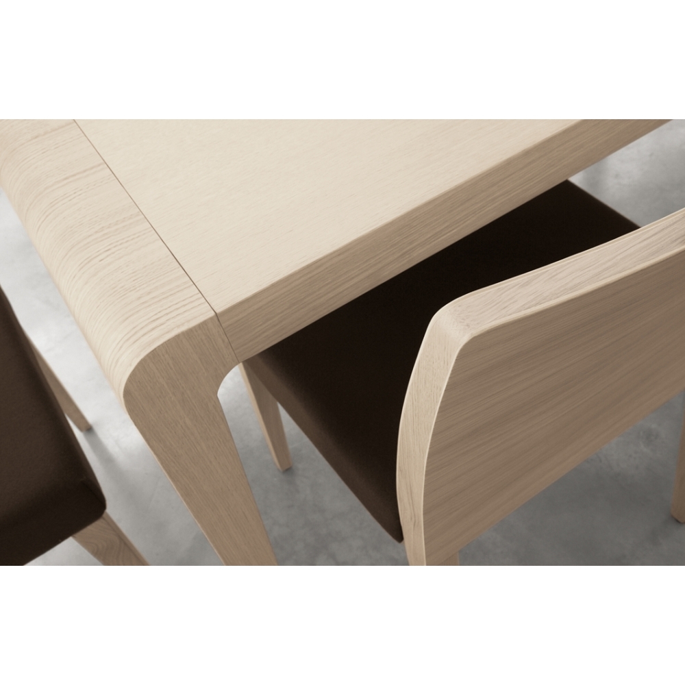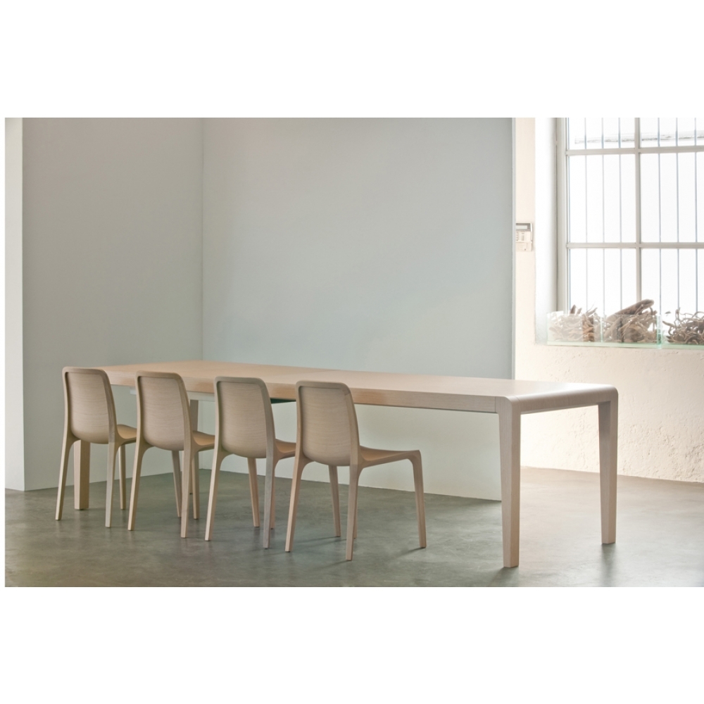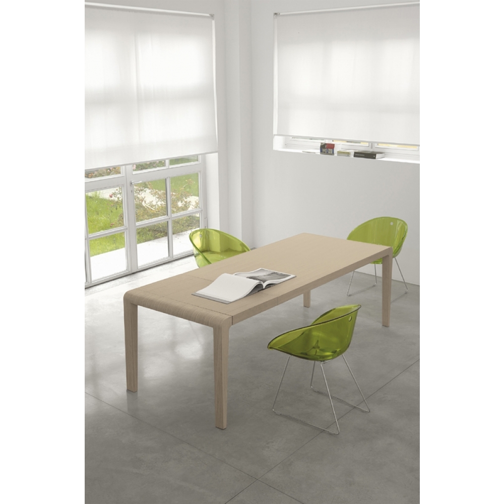 Ausziehbarer Tisch aus furnierter Eiche oder weiß lackierter Buche. Verfügbare Farben: Eiche gebleicht, wenge gebeizt oder weiß matt lackiert. Furnierte Platte, quadratische und kegelige Beine. Die Laufschiene aus Aluminum erlauben eine einfache Verlängerung des Tisches.