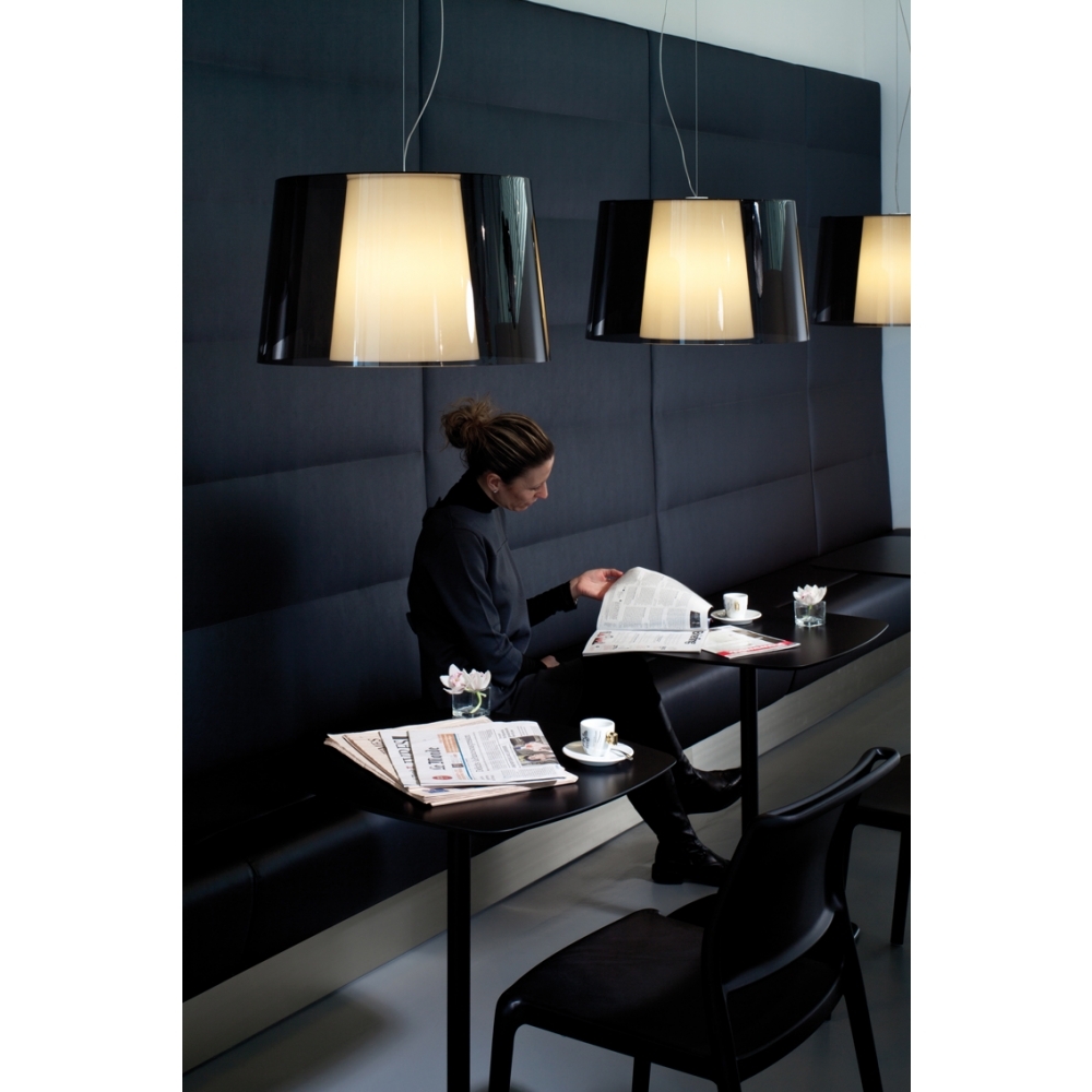 Hängeleuchte mit einem Schirm aus Polycarbonat. Durch zwei verschiedene Schirmgrößen entsteht die Möglichkeit, fünf verschiedene Variationen zu kombinieren. Der Schirm kann abgezogen werden, ohne dass das elektrische Teil abgebaut werden muss.
