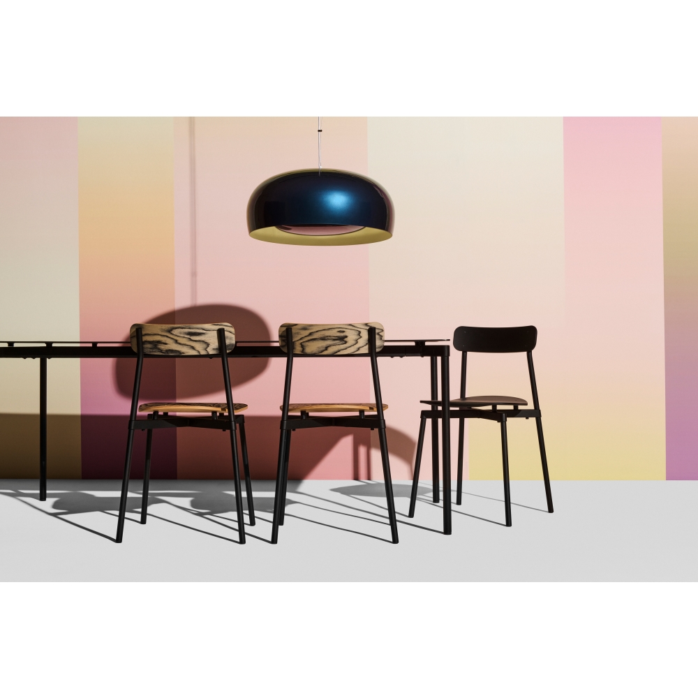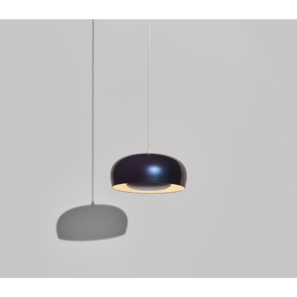 Brush ist eine zeitlose Form der Hängelampe, neu interpretiert mit lebendigen Farben und einer einzigartigen lackierten Oberfläche. Die Pendelleuchten sind mit einer Kuppel und einem Pellet gekleidet, subtil durch die Technik der Aluminiumspinnverfahren gearbeitet, einschließlich der manuellen Spinnen, um die Farbe zu sublimieren. Mehrere Brennvorgänge sind erforderlich, um die metallische Tiefe der Brush-Farben zu erreichen. Die Farbe basiert auf kostbaren Pulvern aus Pigmenten, die beim Brennen metallisch reagieren, was der Farbe ihre metallische Tiefe verleiht. Das Licht wird in der Kuppel für eine diffuse Beleuchtung reflektiert.