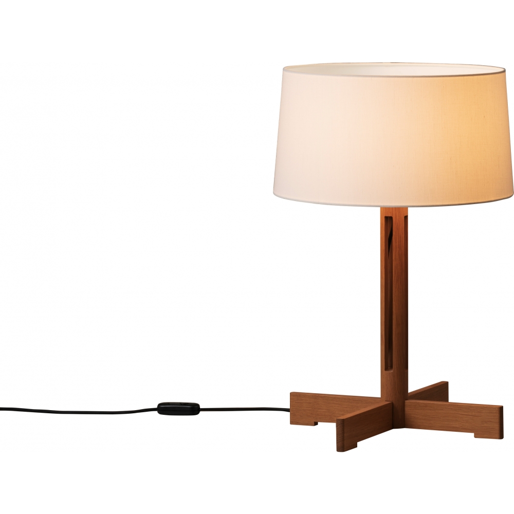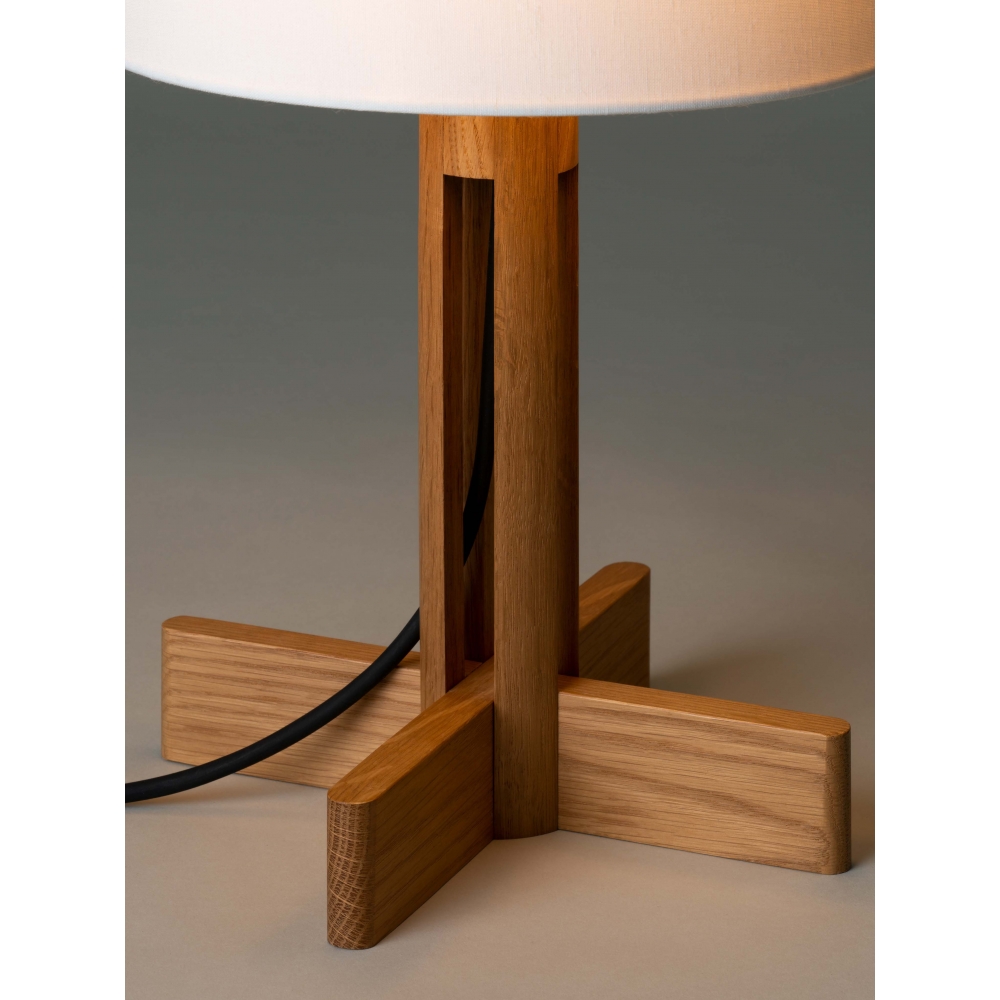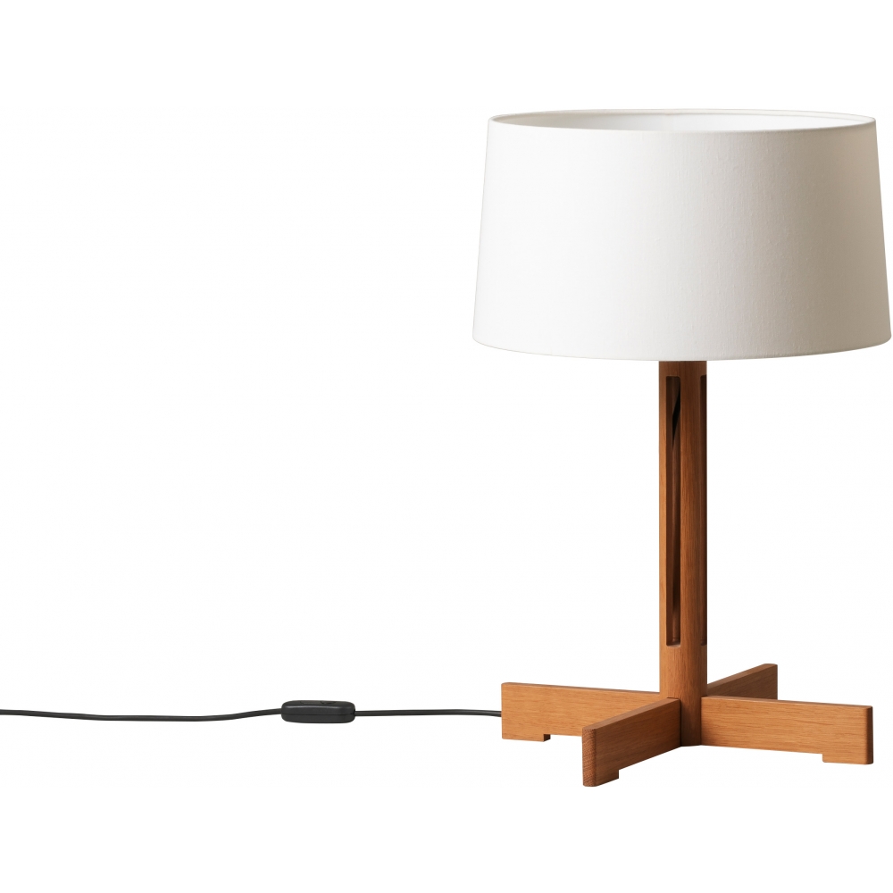 Ursprünglich für den Hauptsitz der FAD (Fostering Arts and Design Association) in Barcelona entworfen. Der FAD wurde 1903 von einer Gruppe von Kunsthandwerkern und Architekten gegründet, die sich große Sorgen über die Folgen der Industrialisierung machten. Jahrzehntelang leistete der Verband Pionierarbeit für die spanische Architektur und projektive Kunst. Nachdem Miguel Milá mit vier Holzresten experimentiert hatte, schuf er die FAD-Lampe. Ihre zylindrische Säule aus Eichenholz schafft eine vertikale Symmetrie, die einen fast zylindrischen weißen Leinenschirm trägt. Die kreuzförmigen Beine, die an andere Klassiker von Miguel Milá erinnern, haben die gleichen Abmessungen wie der untere Umfang des Schirms. Erhältlich in zwei Größen: FAD, die größere Version, bei der das Licht gedimmt werden kann, und FAD menor, die für geringere Anforderungen an die Lichtintensität geeignet ist.
