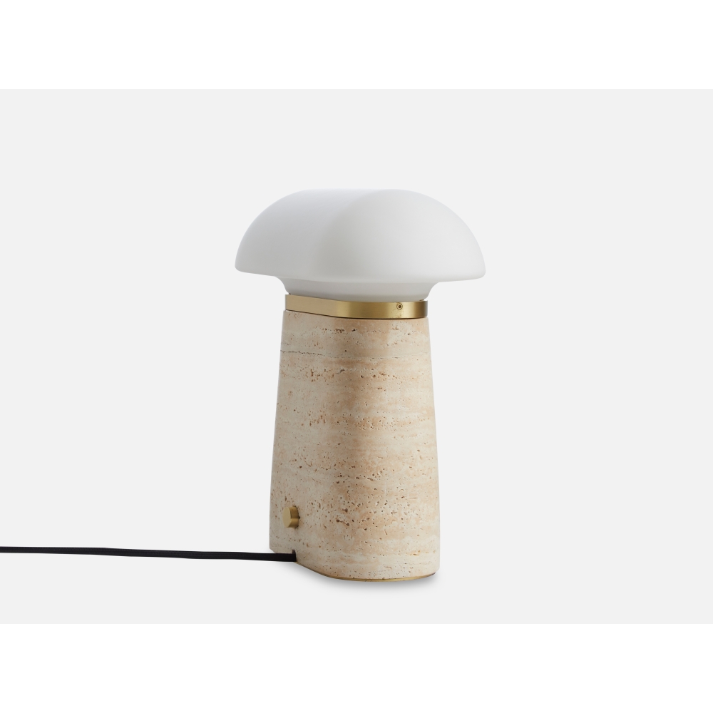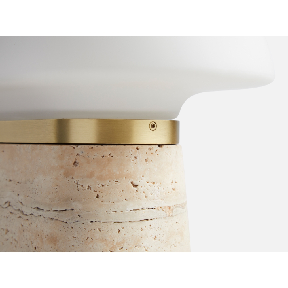 Material Sockel aus massivem Travertin, Schirm aus Opalglas, Details aus Messing
